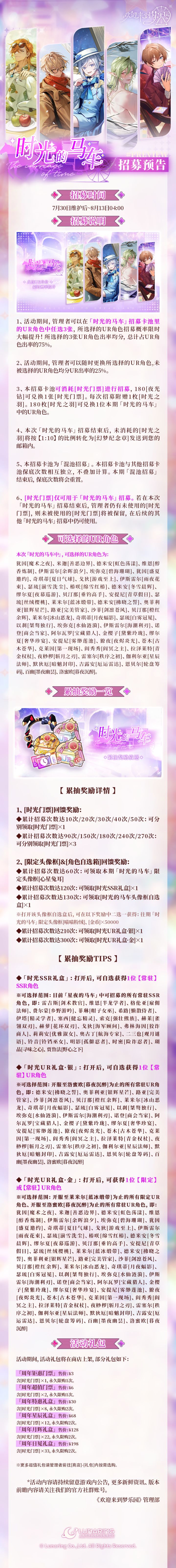 ✨「时光的马车」限时开启!角色心绪&家具限时返场上架!⭐「时光的马车」限时开启-开启时间:7月30日维护后-活动期间,管理者可以在「时光的马车」招募卡池里的UR角色中任选3张,所选择的UR角色招募概率限时大幅提升!-达成累抽档位,即可获得累抽奖励!⭐角色心绪&家具限时返场上架在7月30日维护后,将开启心绪时光及家具限时返场,欢迎管理者前往选购!具体招募及返场信息,管理者可点击下方长图