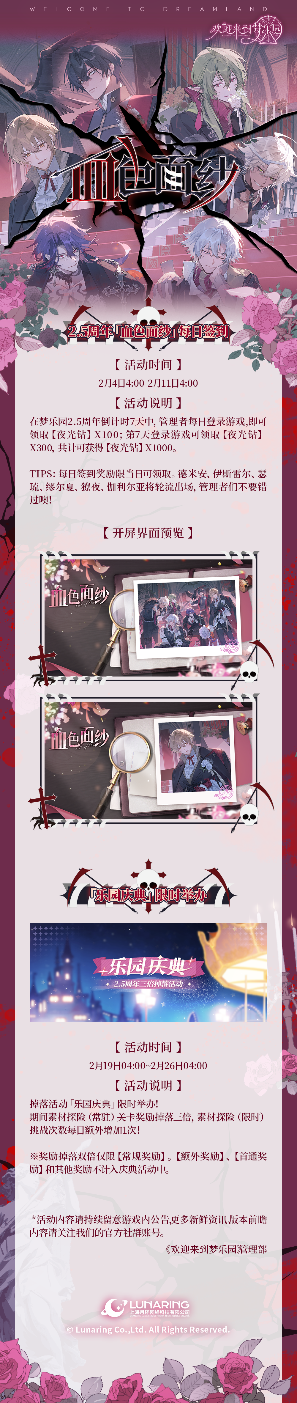 ✨全新活动「血色面纱」2月4日开启!“暗夜缚痕 永绽之白”⭐「2.5周年·血色面纱」倒计时每日签到开启⭐活动时间:2月4日4:00-2月10日4:00⭐活动说明:在「2.5周年版本」开启倒计时7天中,每日登录游戏即可领取夜光钻×100;在2月11日「2.5周年版本」开启当天,登录游戏即可领取夜光钻×300;共可得1000夜光钻! ——————————✨掉落活动「乐园庆典」限时举办