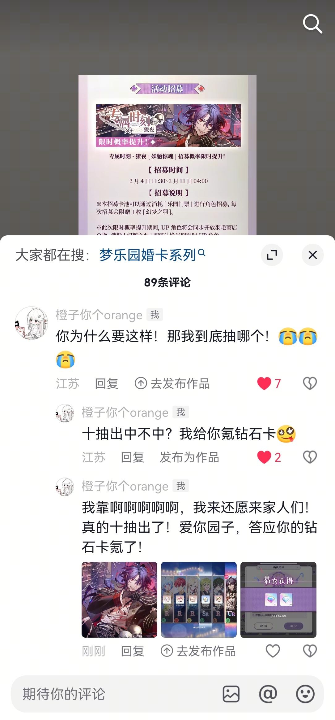 给你评论让我十抽就出,园子你真的宠我了!我爱你园子!给你氪!麻烦继续对我好,我还氪嘻嘻嘻(◍•ᴗ•◍)#欢迎来到梦乐园 #晒欧