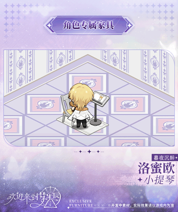 ✨角色专属家具上新⭐新增 洛蜜欧[暮夜沉醉]专属家具「小提琴」!〓上架时间〓5月14日维护后 永久上架!※管理者可在商店-家具中,使用家园币或夜光钻购买「小提琴」家具图纸〓家具介绍〓洛蜜欧非常珍视的小提琴,每天都有在好好保养。※在宿舍中摆放「小提琴」后,当洛蜜欧[暮夜沉醉]入驻宿舍时,可与其进行互动。