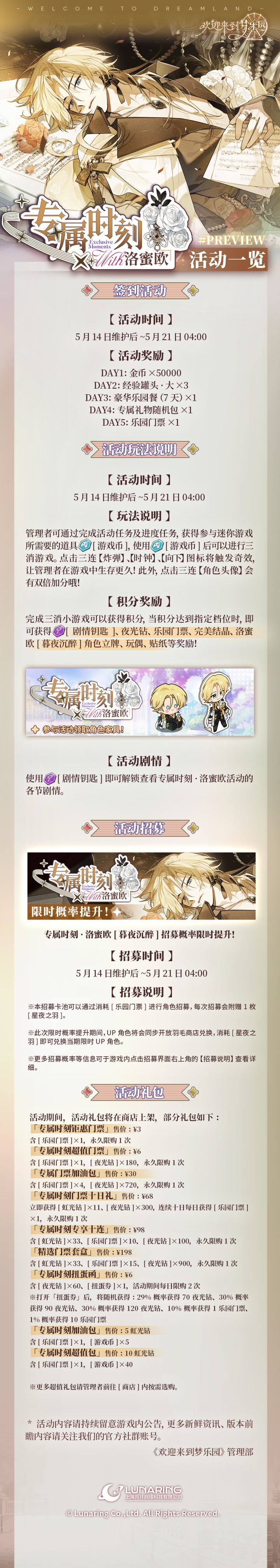 ✨全新迷你活动「专属时刻·洛蜜欧」5月14日开启!- 「专属时刻·洛蜜欧」活动小游戏限时开启- 「专属时刻·洛蜜欧」活动剧情开放- 「专属时刻·洛蜜欧」活动礼包上新- 新增 洛蜜欧[暮夜沉醉] 角色家具,参与活动即可领取- 专属时刻·洛蜜欧[暮夜沉醉] 招募概率限时提升点击下方长图,即可查看活动详情一览↓↓↓