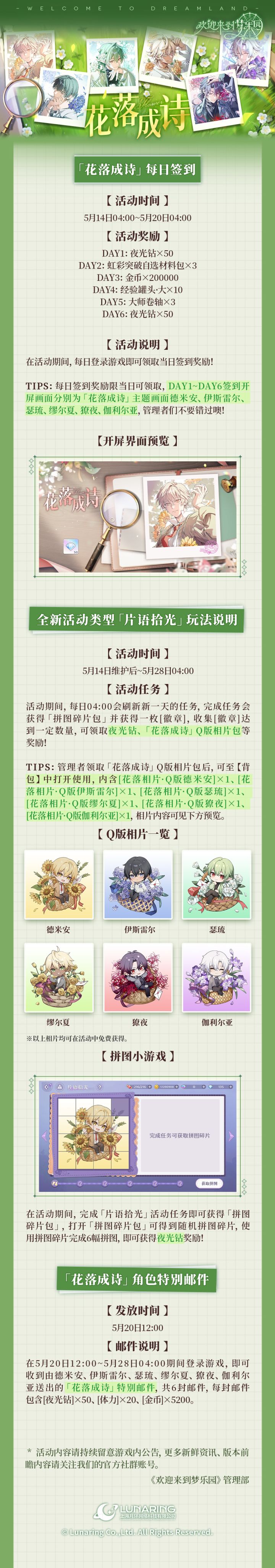 ✨全新活动「片语拾光·花落成诗」5月14日开启!“花落成诗,春日梦歌”⭐「花落成诗」每日签到开启⭐全新活动类型「片语拾光」开启:完成活动任务、参与拼图小游戏,即可领取角色Q版相片、夜光钻等奖励!⭐「花落成诗」角色特别邮件发放点击下方长图,即可查看活动详情一览↓↓↓