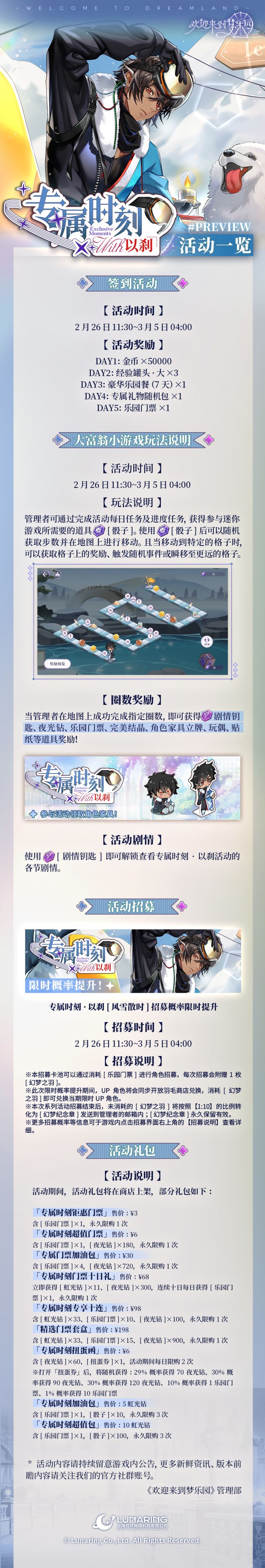 ✨全新迷你活动「专属时刻·以刹」2月26日开启!- 「专属时刻·以刹」活动小游戏限时开启- 「专属时刻·以刹」活动剧情开放- 新增以刹[风雪散时]角色家具,参与活动即可领取- 专属时刻·以刹[风雪散时]招募概率限时提升点击下方长图,即可查看活动详情一览↓↓↓