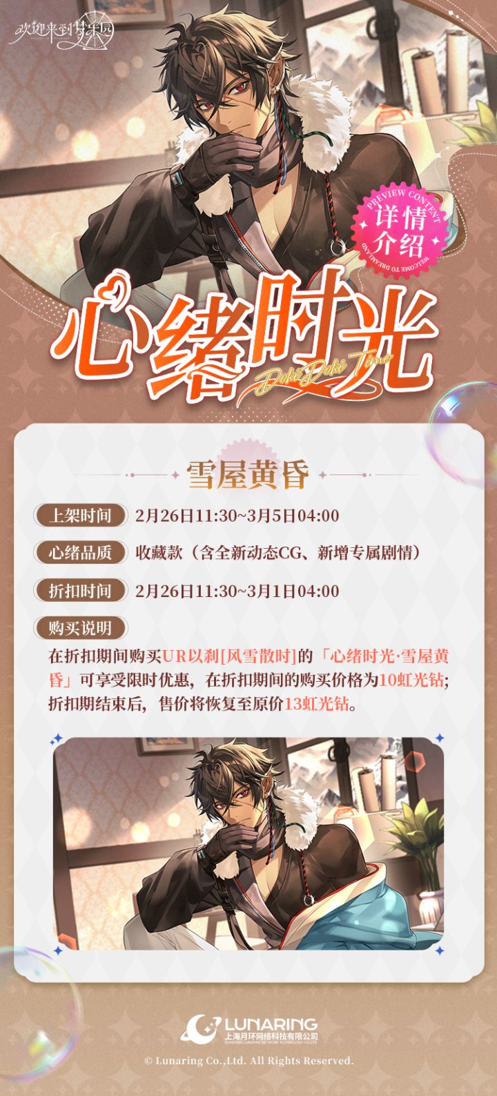 ✨「心绪时光·雪屋黄昏」限时折扣上架!〓折扣时间〓2月26日11:30~3月1日04:00〓心绪说明〓以刹[风雪散时]心绪时光2月26日11:30~3月5日04:00限时上架!- 类型:【收藏款】- 售价:在折扣期间购买「心绪时光·雪屋黄昏」可享受限时优惠,在折扣期间的购买价格为10虹光钻,折扣期结束后,售价将恢复至原价13虹光钻。- 内容:解锁「心绪时光·雪屋黄昏」- 查看:购买