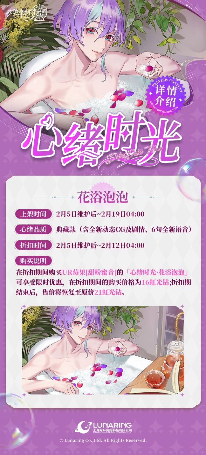 ✨「心绪时光·花浴泡泡」限时折扣上架“很舒服吧?暖暖香香的花瓣浴,紧绷的皮肤是不是一瞬间就被治愈了?”〓折扣时间〓2月5日维护后~2月12日04:00〓心绪说明〓莓果[甜粉蜜音]心绪时光2月5日维护后~2月19日04:00限时上架!- 类型:【典藏款】- 售价:在折扣期间购买「心绪时光·花浴泡泡」可享受限时优惠,在折扣期间的购买价格为16虹光钻,折扣期结束后,售价将恢复至原价21虹光
