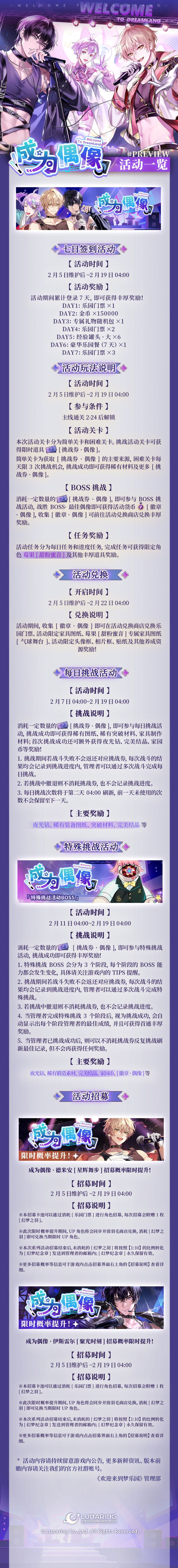 ✨1.5周年·限时活动「成为偶像」一览今夜,舞台将彻夜闪耀。灯光、掌声 、喝彩……让一切如流星般划过夜空吧!「成为偶像」活动将于2月5日维护后开启,点击下方长图,即可查看活动&小游戏详情一览↓↓↓