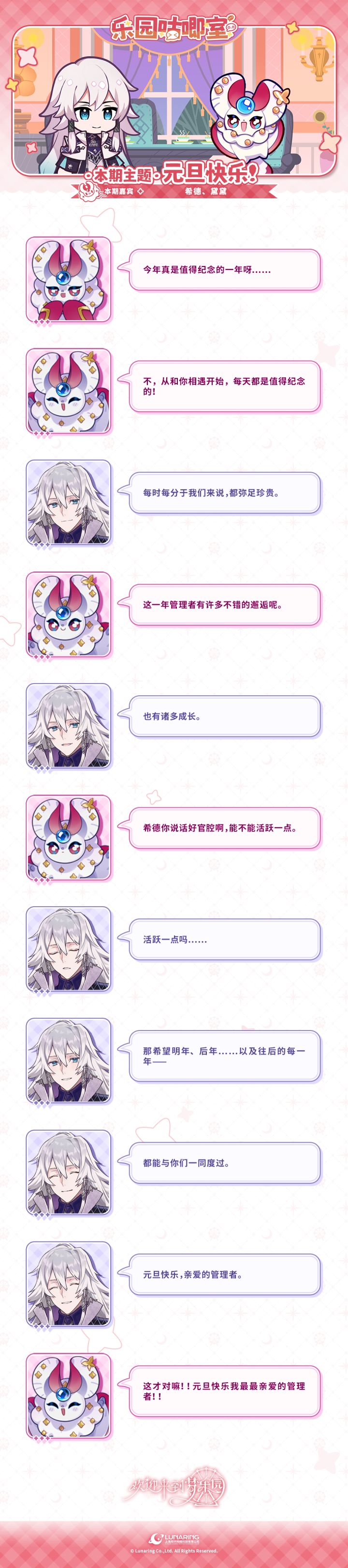 ⭐乐园咕唧室丨特别篇▷特邀嘉宾:希德、黛黛▷本期主题:元旦快乐!管理者们,新年已至,元旦快乐!希德和黛黛已经准备了许多好吃的点心,快坐下来品尝~收下他们的祝福,一起迎接新年吧!——————⭐【元旦】赠礼邮件亲爱的管理者,【元旦】赠礼邮件已经发放至您的游戏内邮箱中,邮件内容为:【乐园门票×3】【体力×100】【金币×20000】,快来查收吧~