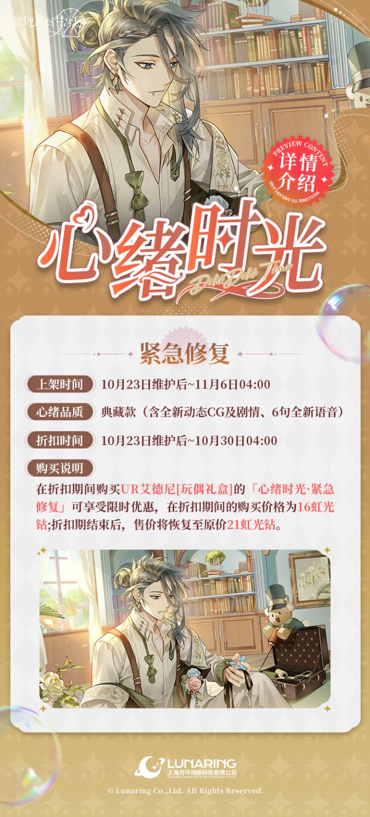 ✨「心绪时光·紧急修复」限时折扣上架!“对不起,我刚才实在是太马虎了。给我一点时间,让我研究一下应该怎么修复它断裂的部分……”〓折扣时间〓10月23日维护后~10月30日04:00〓心绪说明〓艾德尼[玩偶礼盒] 心绪时光10月23日维护后~11月6日04:00限时上架!- 类型:【典藏款】- 售价:在折扣期间购买「心绪时光·紧急修复」可享受限时优惠,在折扣期间的购买价格为16虹光钻,