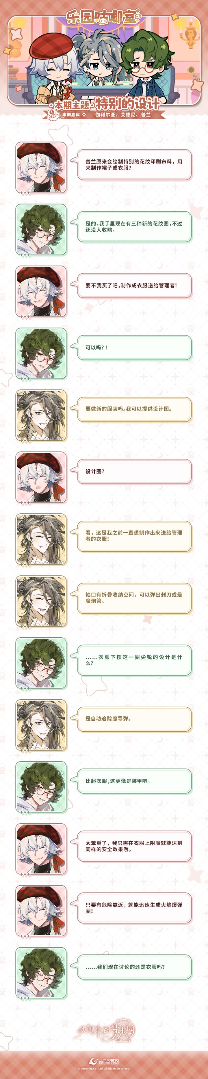 ⭐乐园咕唧室丨VOL.9▷特邀嘉宾:伽利尔亚、艾德尼、普兰▷本期主题:特别的设计管理者们,万圣夜快乐!搞怪的夜晚,就要穿特别的衣装!似乎听到了很好的点子呢……——————⭐【万圣夜】赠礼邮件亲爱的管理者,【万圣夜】赠礼邮件已经发放至您的游戏内邮箱中,邮件内容为:【夜光钻×300】【体力×100】【金币×20000】,快来查收吧~