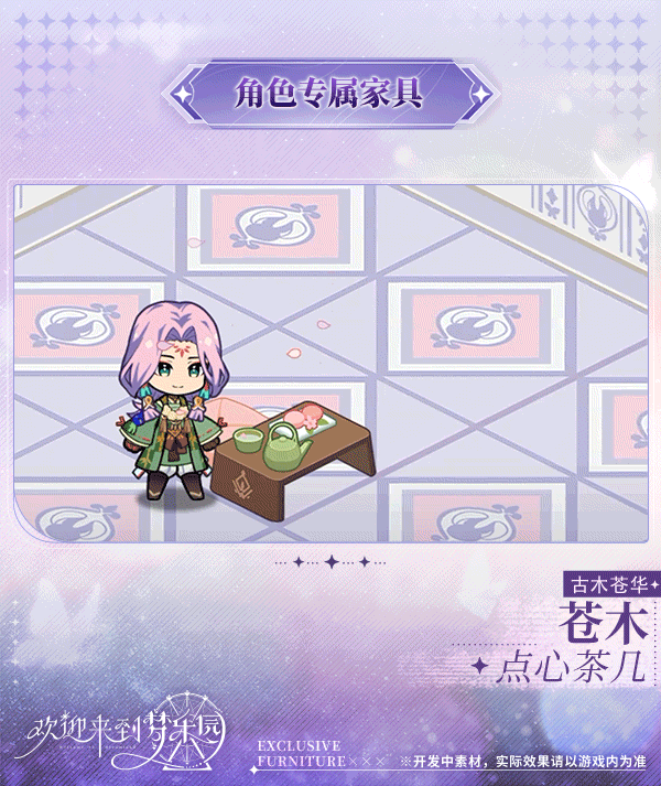 ✨角色专属家具上新⭐新增苍木[古木苍华]专属家具「点心茶几」!〓上架时间〓10月16日11:30后永久上架!※管理者可在商店-家具中,使用家园币或夜光钻购买「点心茶几」家具图纸〓家具介绍〓舒适且方便的小茶几,是与朋友坐下来闲谈的好地方。※在宿舍中摆放「点心茶几」后,当苍木[古木苍华] 入驻宿舍时,可与其进行互动。