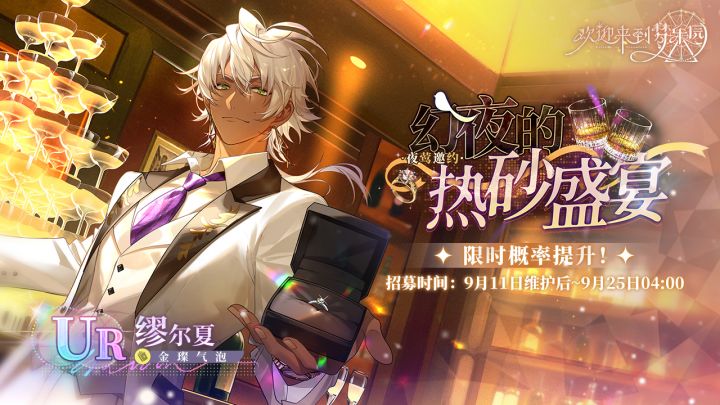 【夜莺邀约·幻夜的热砂盛宴·缪尔夏[金璨气泡]·招募预告】本期新角色UR缪尔夏[金璨气泡]即将进行限时招募概率提升!⭐招募时间09/11维护后 - 09/25 04:00⭐UP角色UR缪尔夏[金璨气泡](光)(占UR出率的50%)⭐招募说明※本招募卡池可以通过消耗[乐园门票]进行角色招募,每次招募会附赠1枚[幻梦之羽]。※此次限时概率提升期间,UP角色将会同步开放羽毛商店兑换,消耗