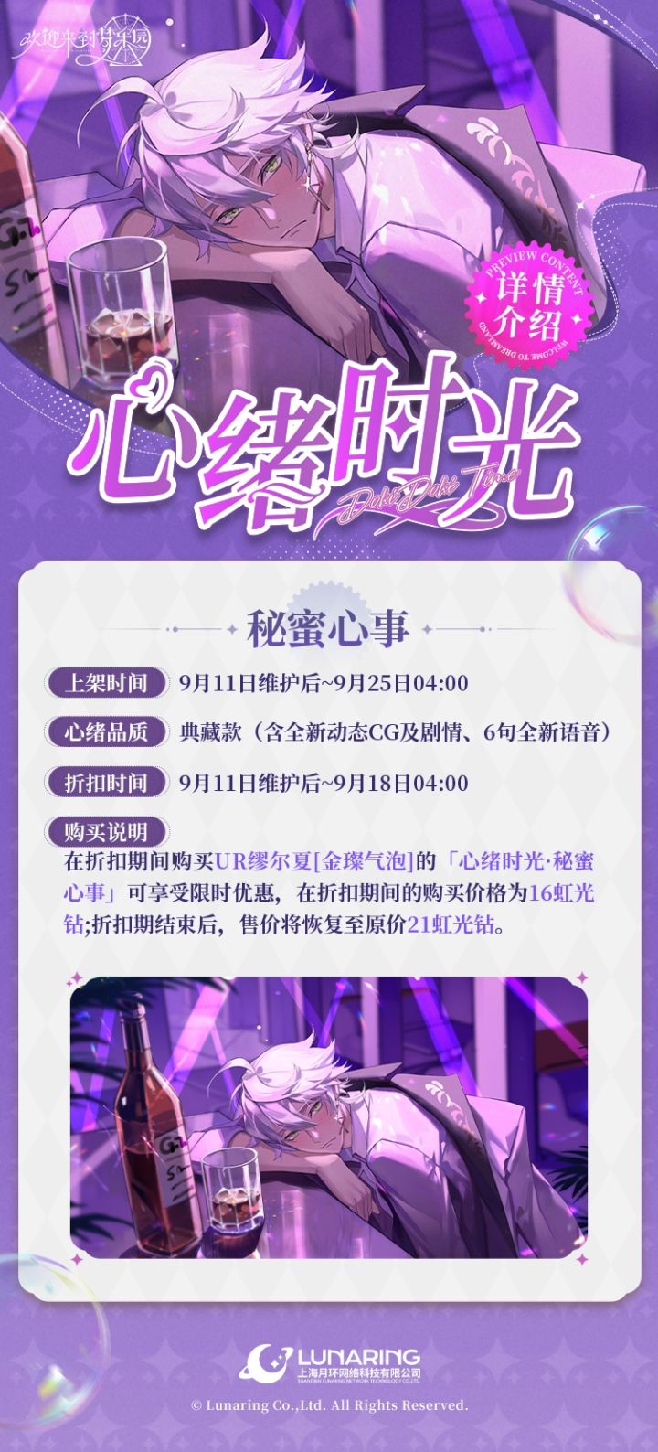 ✨「心绪时光·秘蜜心事」限时折扣上架〓折扣时间〓9月11日维护后~9月18日04:00〓心绪说明〓缪尔夏[金璨气泡] 心绪时光9月11日维护后~9月25日04:00限时上架!- 类型:【典藏款】- 售价:在折扣期间购买「心绪时光·秘蜜心事」可享受限时优惠,在折扣期间的购买价格为16虹光钻,折扣期结束后,售价将恢复至原价21虹光钻。- 内容:解锁「心绪时光·秘蜜心事」- 查看:购买后