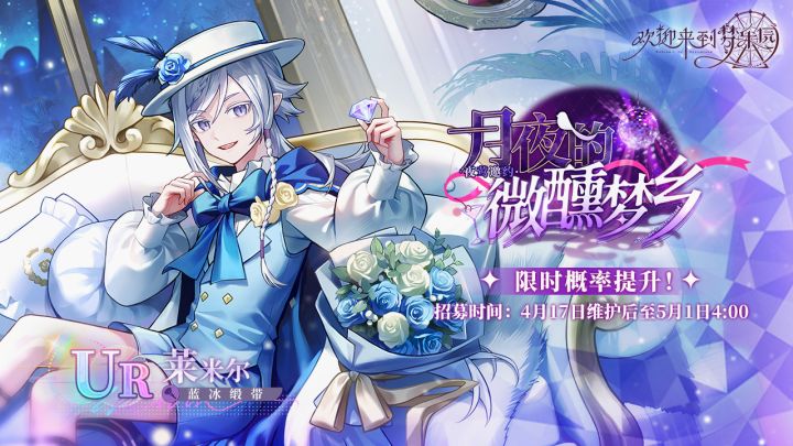 【夜莺邀约·月夜的微醺梦乡·莱米尔[蓝冰缎带]·招募预告】本期新角色UR莱米尔[蓝冰缎带]即将进行限时招募概率提升!⭐招募时间04/17维护后 - 05/01 04:00⭐UP角色UR莱米尔[蓝冰缎带](暗)(占UR出率的50%)⭐招募说明※本招募卡池可以通过消耗[乐园门票]进行角色招募,每次招募会附赠1枚[幻梦之羽]。※此次限时概率提升期间,UP角色将会同步开放羽毛商店兑换,消耗