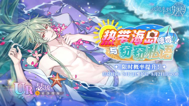 【惊奇!!热带海岛与窃窃私语·瑟琉[星沙缀海]·招募预告】本期新角色UR 瑟琉[星沙缀海] 即将进行限时招募概率提升!⭐招募时间08/07维护后 - 08/21 04:00⭐UP角色UR 瑟琉[星沙缀海](雷)(占UR出率的50%)⭐招募说明※本招募卡池可以通过消耗[乐园门票]进行角色招募,每次招募会附赠1枚[幻梦之羽]。※此次限时概率提升期间,UP角色将会同步开放羽毛商店兑换,消