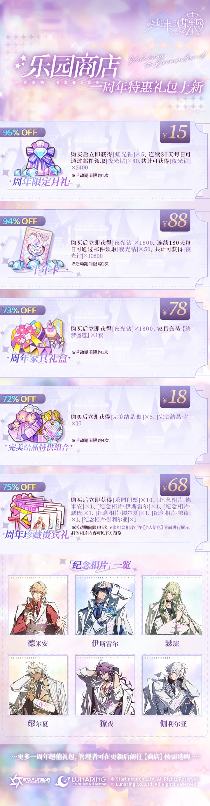 ✨「乐园商店」一周年特惠礼包上新&限时返场⭐一周年特惠礼包超值「周年限定月礼」、「半年卡」、「完美结晶特供组合」特惠上架!⭐一周年自选礼包各类钜惠自选礼包,限时上新!⭐商店首充赠送重置在8月7日维护后,管理者可在【商店】-【充值】中,重新享受一次首充赠送!⭐心绪时光、家具特别返场在8月7日维护后,将开启心绪时光及家具限时返场,欢迎管理者前往选购!具体礼包信息,管理者可点击下图查看