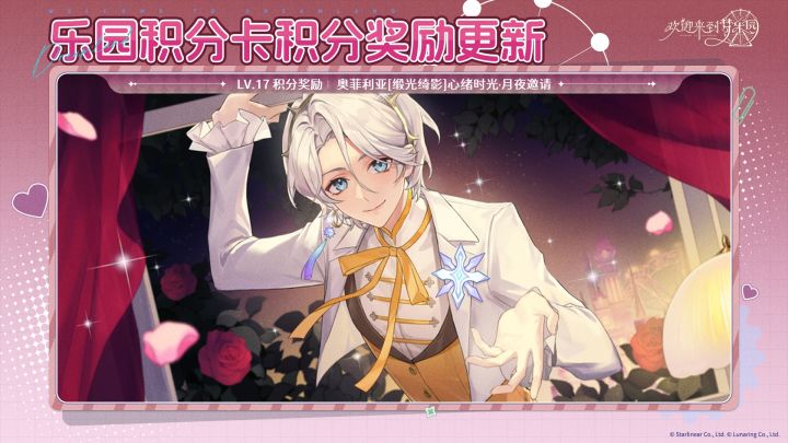 ✨乐园积分卡·积分奖励更新⭐「乐园积分卡」新增lv.17积分奖励:奥菲利亚[缎光绮影]心绪时光「月夜邀请」〓心绪说明〓-更新时间:8月7日维护后-获取方式:「乐园积分卡」积分等级达到lv.17-内容:奥菲利亚[缎光绮影]全新动态CG、新增专属剧情-查看:获取后可设置为主界面;专属剧情可以前往【角色档案】-【心绪时光】查看。