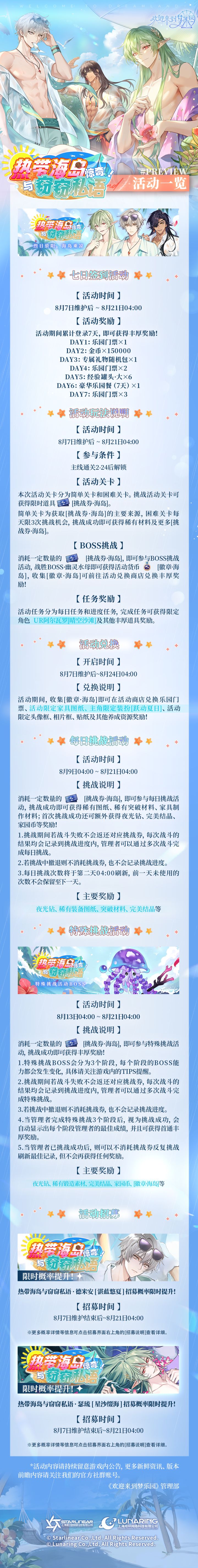✨一周年·夏日特别活动「惊奇!!热带海岛与窃窃私语」一览细沙、海浪、热带森林与潜藏其中的未知遗迹……是冒险,还是假期?「惊奇!!热带海岛与窃窃私语」活动将于8月7日维护后开启,点击下方长图,即可查看活动&小游戏详情一览↓↓↓