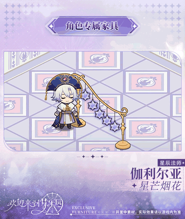 ✨角色专属家具上新⭐新增伽利尔亚[星辰法师]专属家具「星芒烟花」!〓上架时间〓7月24日维护后永久上架!※管理者可在商店-家具中,使用家园币或夜光钻购买「星芒烟花」家具图纸〓家具介绍〓由金牌魔法师亲自制作的浪漫烟花小道具,增进气氛的绝佳选择。※在宿舍中摆放「星芒烟花」后,当伽利尔亚[星辰法师]入驻宿舍时,可与其进行互动。