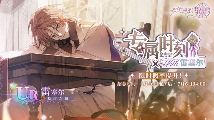 【专属时刻·雷塞尔[秩序之初]·招募预告】⭐招募时间2024/6/26 维护结束后 - 2024/7/6 04:00⭐UP角色UR 雷塞尔[秩序之初](地)(占UR出率的50%)*本次招募开启时,以上角色已同步永久加入标准招募「星夜的马车」⭐兑换截止时间:2024/7/6 04:00⭐招募说明※本招募卡池可以通过消耗[乐园门票]进行角色招募,每次招募会附赠1枚[星夜之羽]。※此