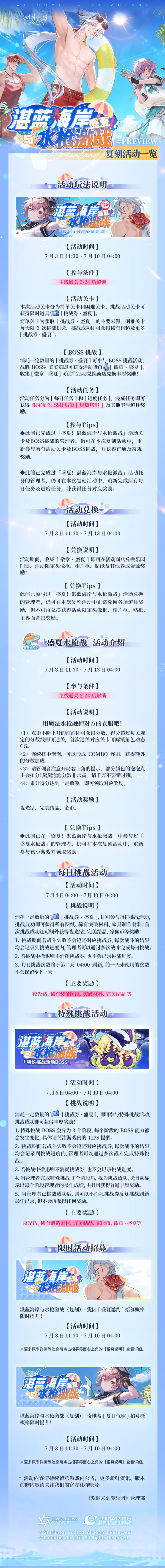 ✨复刻活动丨「盛夏!湛蓝海岸与水枪激战」复刻活动详情一览夏日水上活动比拼即将灼热展开!拿上水枪,换好泳衣,与伙伴们为了最终结果共同努力吧!⭐活动期间,「盛夏水枪战」小游戏开放,用魔法水枪融掉对方的衣服吧!「盛夏!湛蓝海岸与水枪激战」复刻活动将于7月3日11:30开启,点击下方长图,即可查看详情一览↓↓↓