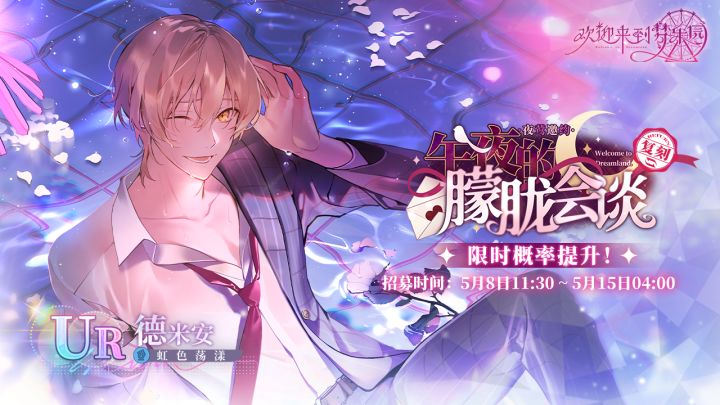 【夜莺邀约·午夜的朦胧会谈·德米安 [虹色荡漾]·招募预告】复刻活动「夜莺邀约·午夜的朦胧会谈」角色UR德米安 [虹色荡漾]即将进行限时招募概率提升!⭐招募时间2024/5/8 11:30 - 2024/5/15 04:00⭐UP角色UR 德米安 [虹色荡漾](水)(占UR出率的50%)⭐招募说明※本招募卡池可以通过消耗[乐园门票]进行角色招募,每次招募会附赠1枚[幻梦之羽]。※此