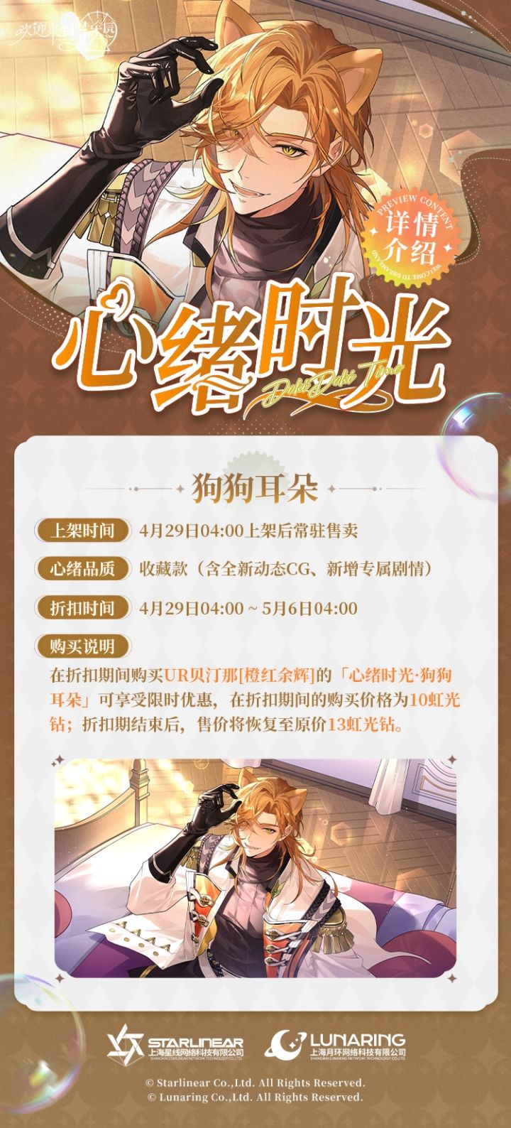 ✨「心绪时光·狗狗耳朵」限时折扣上架〓折扣时间〓4月29日04:00~5月6日04:00〓心绪说明〓贝汀那 [橙红余辉] 心绪时光4月29日04:00后永久上架!- 类型:【收藏款】- 售价:在折扣期间购买「心绪时光·狗狗耳朵」可享受限时优惠,在折扣期间的购买价格为10虹光钻,折扣期结束后,售价将恢复至原价13虹光钻。- 内容:解锁「心绪时光·狗狗耳朵」- 查看:购买后可设置为主界