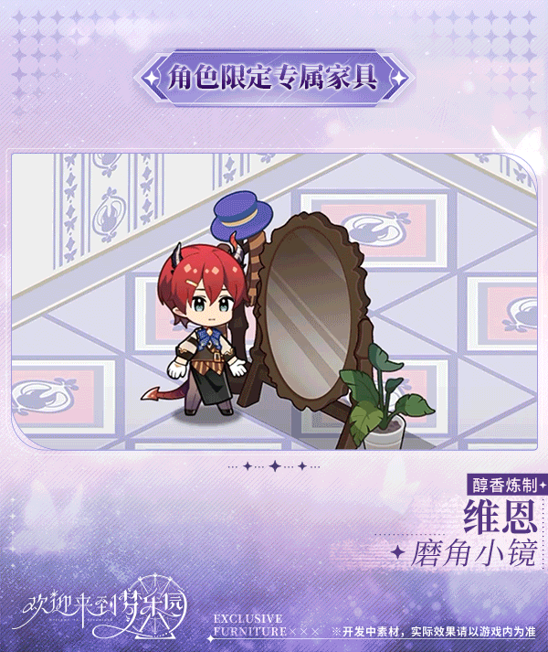 ✨角色限定专属家具上新⭐新增维恩[醇香炼制]限定专属家具「磨角小镜」!〓上架时间〓2024年5月8日11:30~5月15日04:00限时上架〓家具介绍〓半龙人炼金术师常用的梳妆镜。虽然是梳妆镜,但每个月只有在临近房租缴交日期的时候会被想起来使用。※在宿舍中摆放「磨角小镜」后,当维恩[醇香炼制]入驻宿舍时,可与其进行互动。