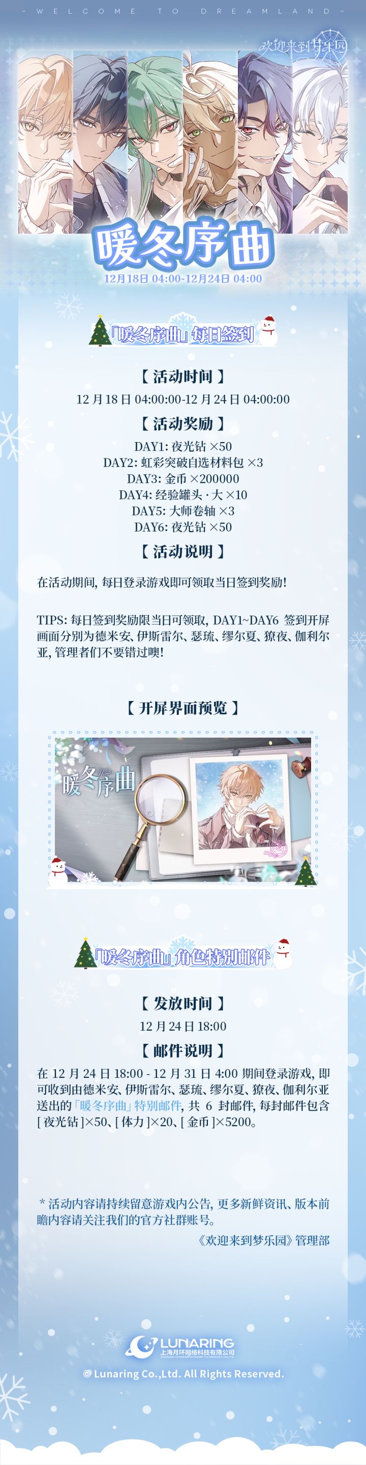 ✨全新活动「暖冬序曲」12月18日开启!烛火摇曳,冬夜绵长;此刻永恒,与你共叙。⭐「暖冬序曲」每日签到开启⭐「暖冬序曲」角色特别邮件发放#女性向 #手游 #欢迎来到梦乐园