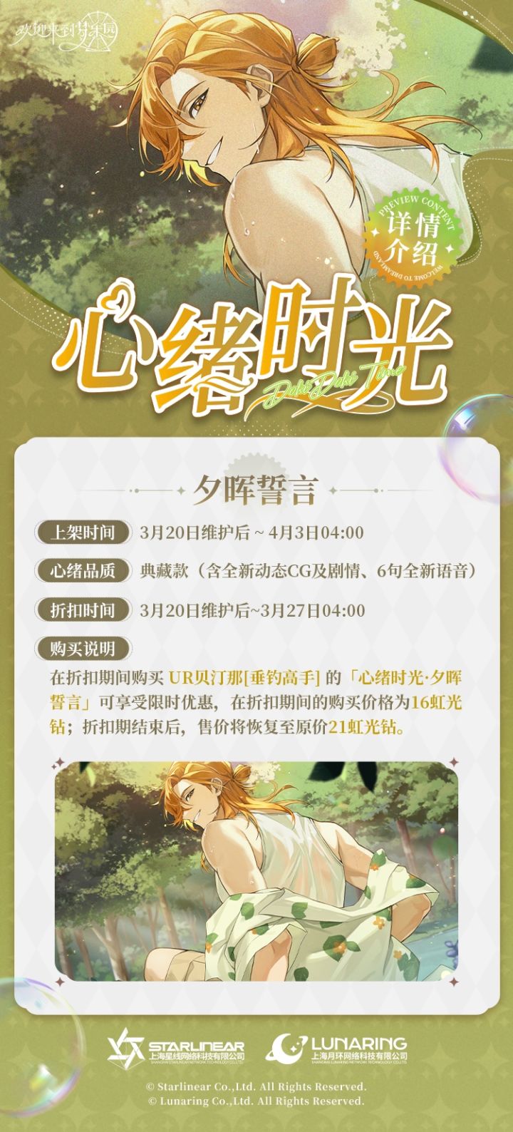 ✨「心绪时光·夕晖誓言」限时折扣上架〓折扣时间〓3月20日维护后~3月27日04:00〓心绪说明〓贝汀那[垂钓高手]心绪时光3月20日维护后~4月3日04:00限时上架!- 类型:【典藏款】- 售价:在折扣期间购买「心绪时光·夕晖誓言」可享受限时优惠,在折扣期间的购买价格为16虹光钻,折扣期结束后,售价将恢复至原价21虹光钻。- 内容:解锁「心绪时光·夕晖誓言」- 查看:购买后可设