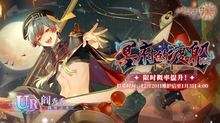 【冥府的渡船·阎秀秀 [阎冥之主]·招募预告】⭐招募时间2023/12/20 维护结束后 - 2024/1/3 04:00⭐UP角色UR 阎秀秀 [阎冥之主](火)(占UR出率的50%)*本次招募开启时,以上角色已同步永久加入标准招募「星夜的马车」⭐兑换截止时间:2024/1/3 04:00⭐招募说明※本招募卡池可以通过消耗[乐园门票]进行角色招募,每次招募会附赠1枚[星夜之羽