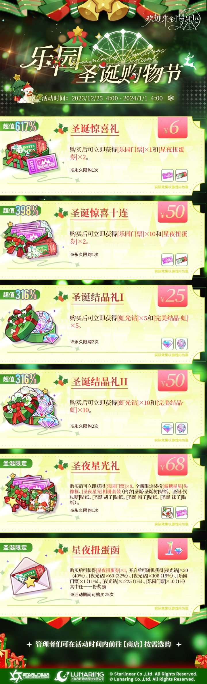 ✨「乐园圣诞购物节」预告-活动时间:12月25日04:00-2024年1月1日4:00-活动说明:活动期间,以下礼包内容在商店内上架并限时售卖。◆「乐园圣诞购物节」商店礼包·限时上新:- 「圣诞惊喜礼」售价:¥6,含[乐园门票]×1,[星夜扭蛋券]×2,永久限购1次。- 「圣诞惊喜十连」售价:¥50,含[乐园门票]×10,[星夜扭蛋券]×2,永久限购1次。- 「圣诞结晶礼I」售价:¥2