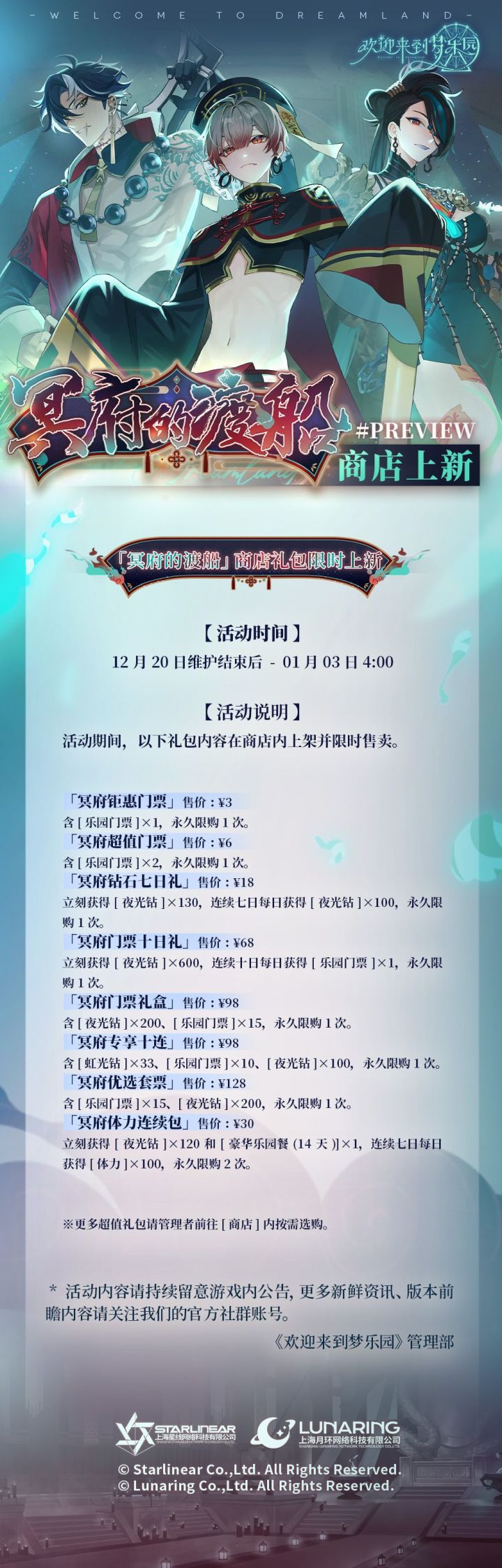 ✨全新常驻活动丨「冥府的渡船」商店礼包·限时上新- 上架时间:12月20日维护结束后-2024年01月03日4:00- 活动说明:活动期间,以下礼包内容在商店内上架并限时售卖。部分礼包/系列礼包 内容如下:「冥府钜惠门票」售价:¥3,含[乐园门票]x1,永久限购1次。「冥府超值门票」售价:¥6,含[乐园门票]x2,永久限购1次。「冥府钻石七日礼」售价:¥18,立刻获得[夜光钻]x13