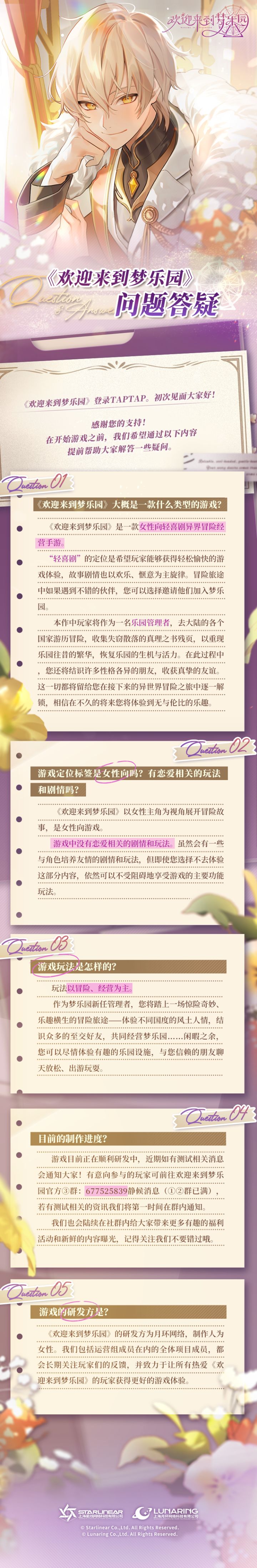 感谢大家一直以来对《欢迎来到梦乐园》的热切期待和关注。在开始游戏之前,我们希望通过以下内容提前帮助大家解答一些疑问。后续游戏相关信息会第一时间通过各渠道平台告知大家,乐园的大门永远为您敞开~再次感谢大家对梦乐园的支持与关注!未来我们也希望以更加完美的姿态早日与大家见面,还请多多期待~⭐欢迎关注我们的官方账号,获取更多新鲜资讯。官方微博:https://weibo.com/u/751430