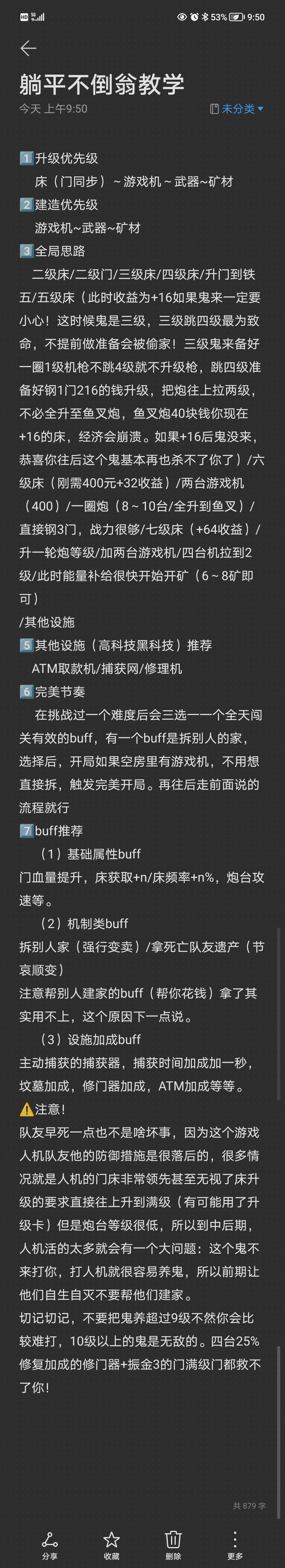 想想给大家做个小攻略吧,不是很牛的大佬,只是我自己的打法。 1.开局16先别升门,优先升级床,然后再门,然后直接等着把床直接升两级会让你节奏快很多。接着升级门到铁5,床200,400连升(只要不是鬼持续挠你门,这个节奏就能快很多) 2.鬼是根据挠门升级的,我个人倾向在+16的时候就把水炮做出来,可以顶好久的了(这是鬼来找你的时候,如果没找你,我还是倾向先把+32的床做出来,为了稳妥起见,可以多等一会多留点钱再升,以防鬼来找你的时候你刚升完床没钱) 3.+32的时候再做游戏机,也不需要太多 4.矿山128完了不用升级1024,拆了再直接搞,反而更赚 5.到了这会队友应该噶差不多了,然后你就要注意把资源留一留,优先升级门了,炮台也要跟一跟 6.到了后期,鬼每级属性增幅都挺高的,所以我个人来说,我会预留一些资源,看鬼升级我也升 目前就这么多,有什么想知道的可以问我(也不算大佬,打了两三天六七个小时,知道的就会说,如果攻略有错可以提出来,因为这只是我的个人打法可能有些问题)