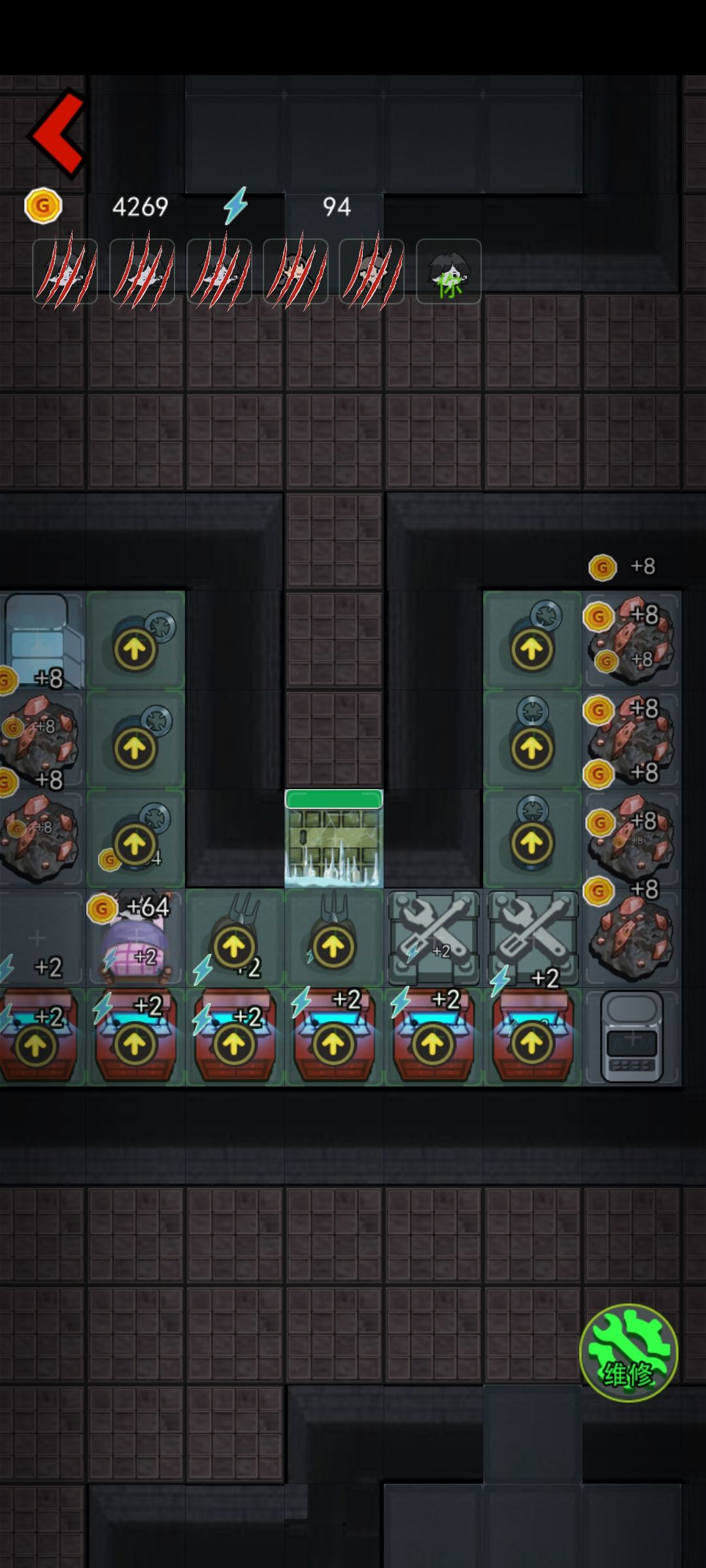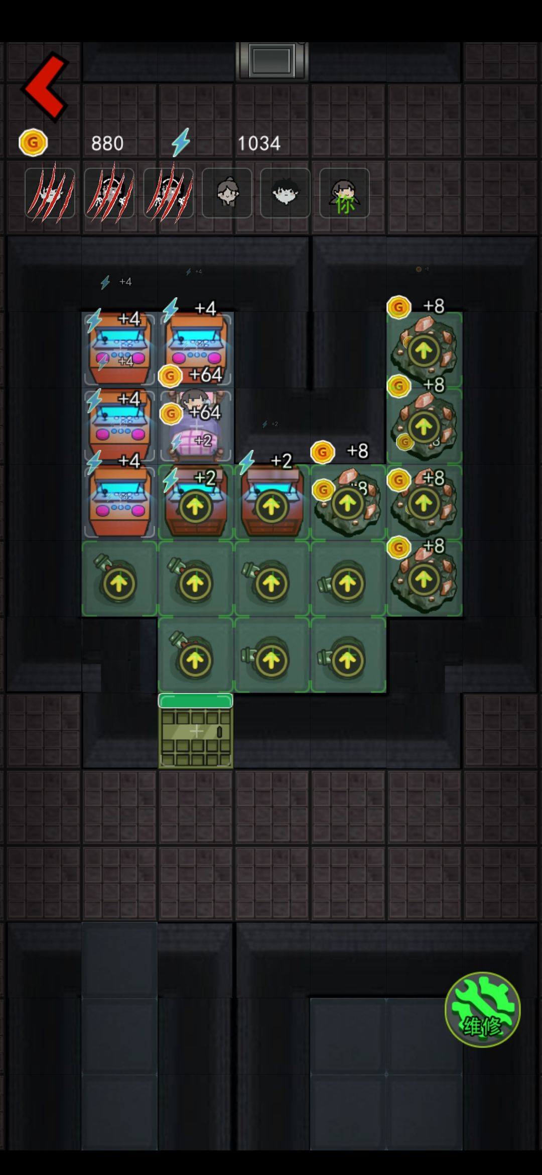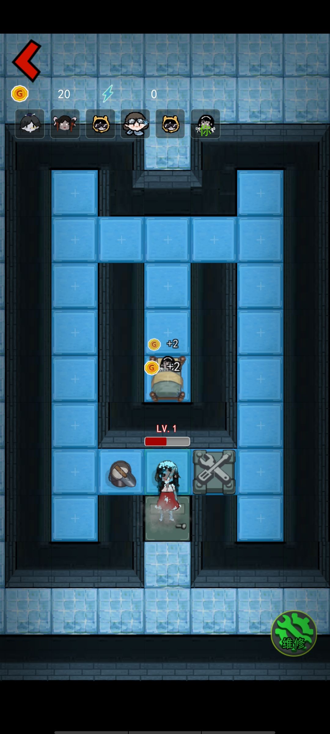 我之前数了一下大概鬼回血到门口的时间是10秒左右,这个时间你可以攒40金币,后面如果鬼没来,那你就攒100金币升级床到8金币一秒,期间还是要注意鬼的动向,鬼来了就升级门+放炮。