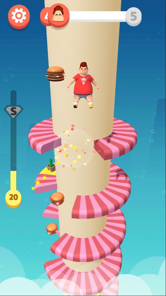 游戏过程中通过左右滑动控制小人吃掉汉堡增加力量,当力量累积到一定程度时,小人自动进入暴走模式,暴走模式下,小人可以直接击碎所有堆叠的障碍