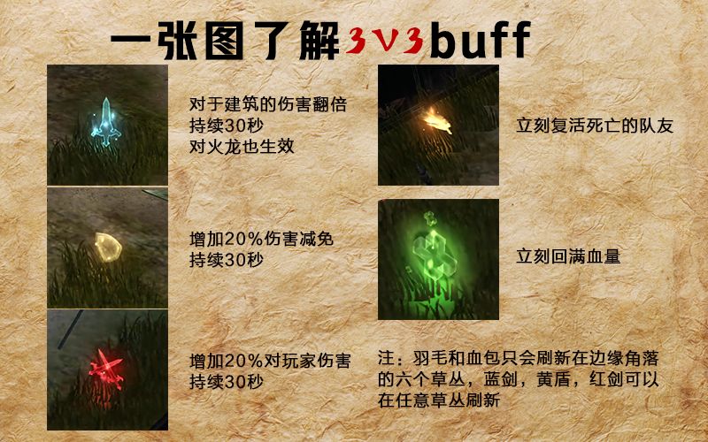 有关于天使之战3v3的打法与基础教学 分为以下两个点,基本道具规则和打法理解 一、基本道具规则 1)道具机制,整个场地现阶段有9个草丛,每个草丛分别会刷取一下buff与道具 其中各个道具效果, 1. 蓝剑:对于建筑的伤害翻倍,持续30秒,对火龙也生效 2. 红色交叉剑:增加20%对玩家伤害,持续30秒 3. 盾牌:增加20%伤害减免,持续30秒 4. 血包:立刻回满血量 5. 羽毛:立刻复活死亡的