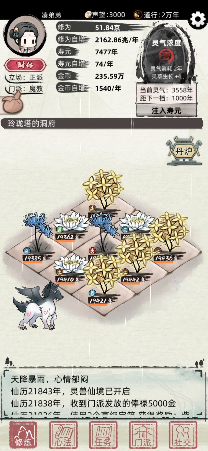 第四部:正派的心法,升级可以自增钱和寿命,最好选择词条有自增钱的功法