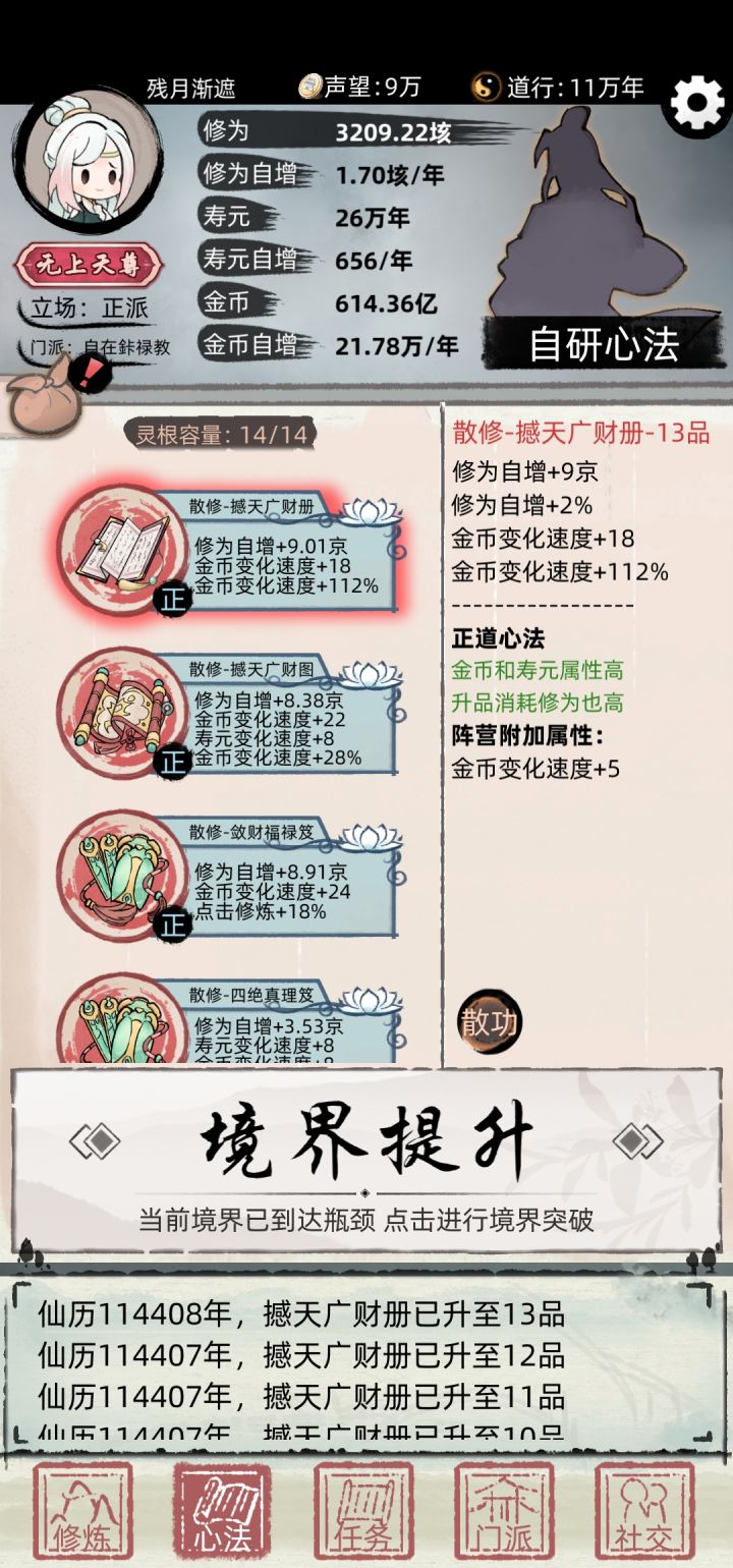 修仙世界 金钱开道!此攻略主要面向老手,各种小技巧让你熟悉游戏后更快修仙转世到九重天。先上毕业照1、开局到加入第一个宗门,推荐正道宗门,正道功法有金钱,寿元加成。2、正道功法篇:接奖励箱子的正道立场任务,领奖时包里不能有同样的箱子,保证你领取的箱子是包里第一个。后面只要包里箱子的一直最少保留有1个,不管你从任务 商店 宗门 得到的中立邪派箱子都只会开出正道功法。(如下图我接个奖励初级宝箱