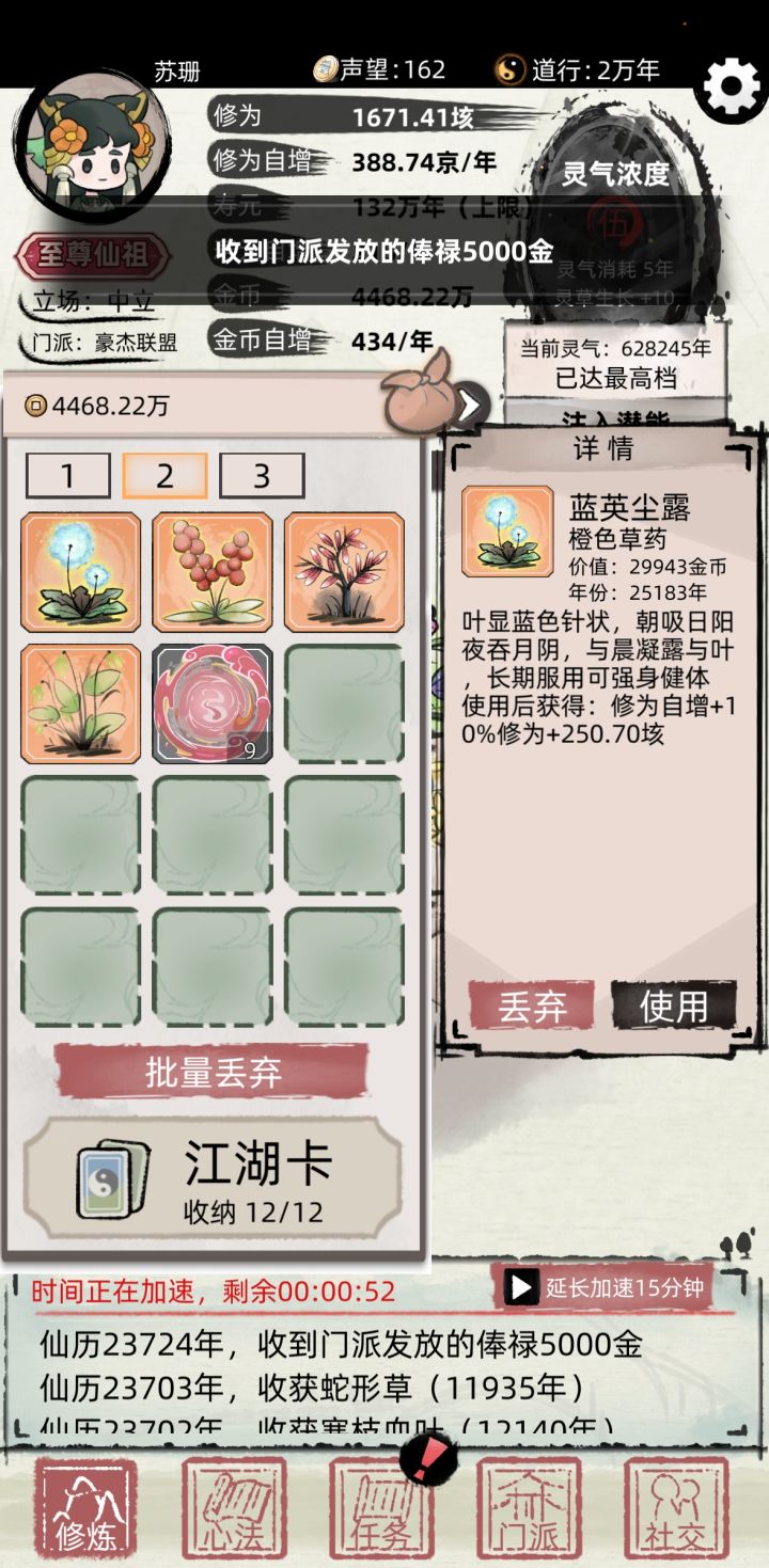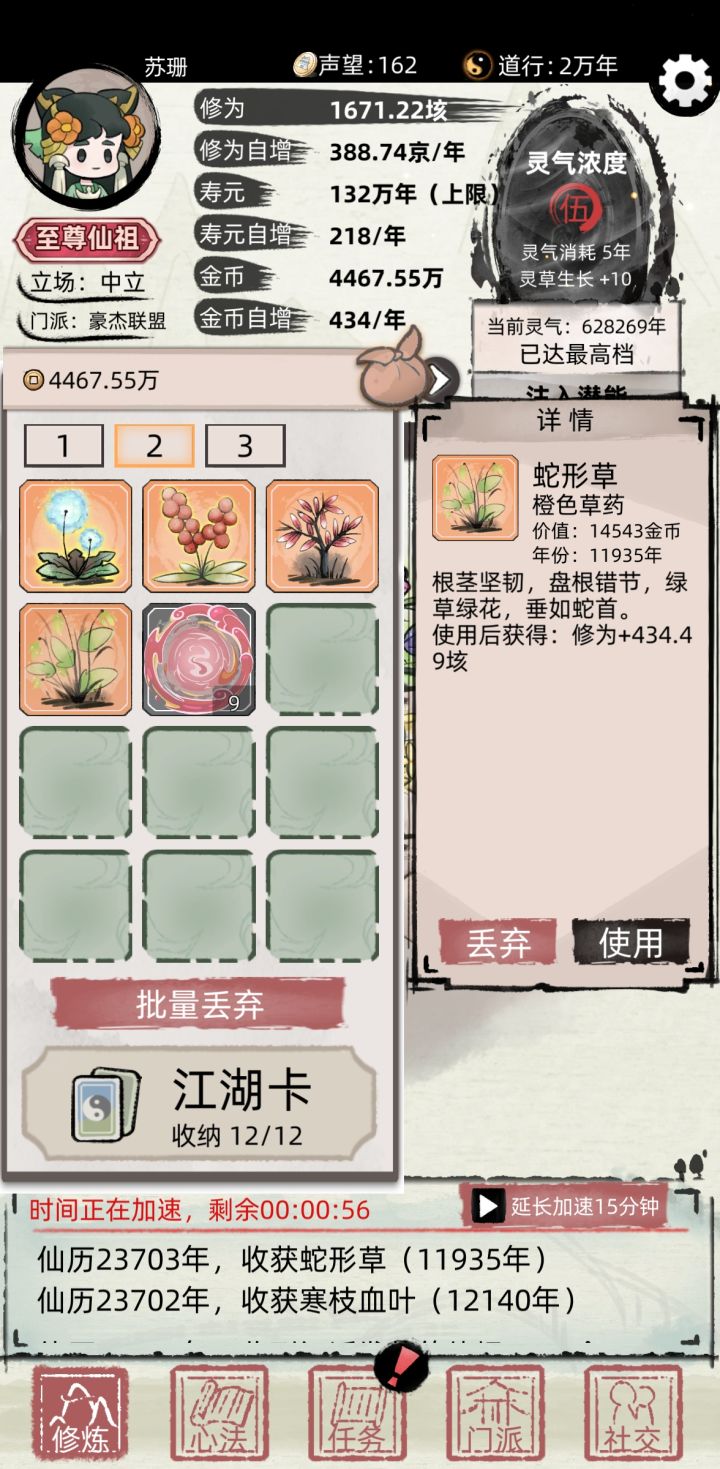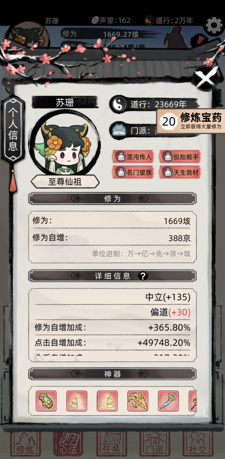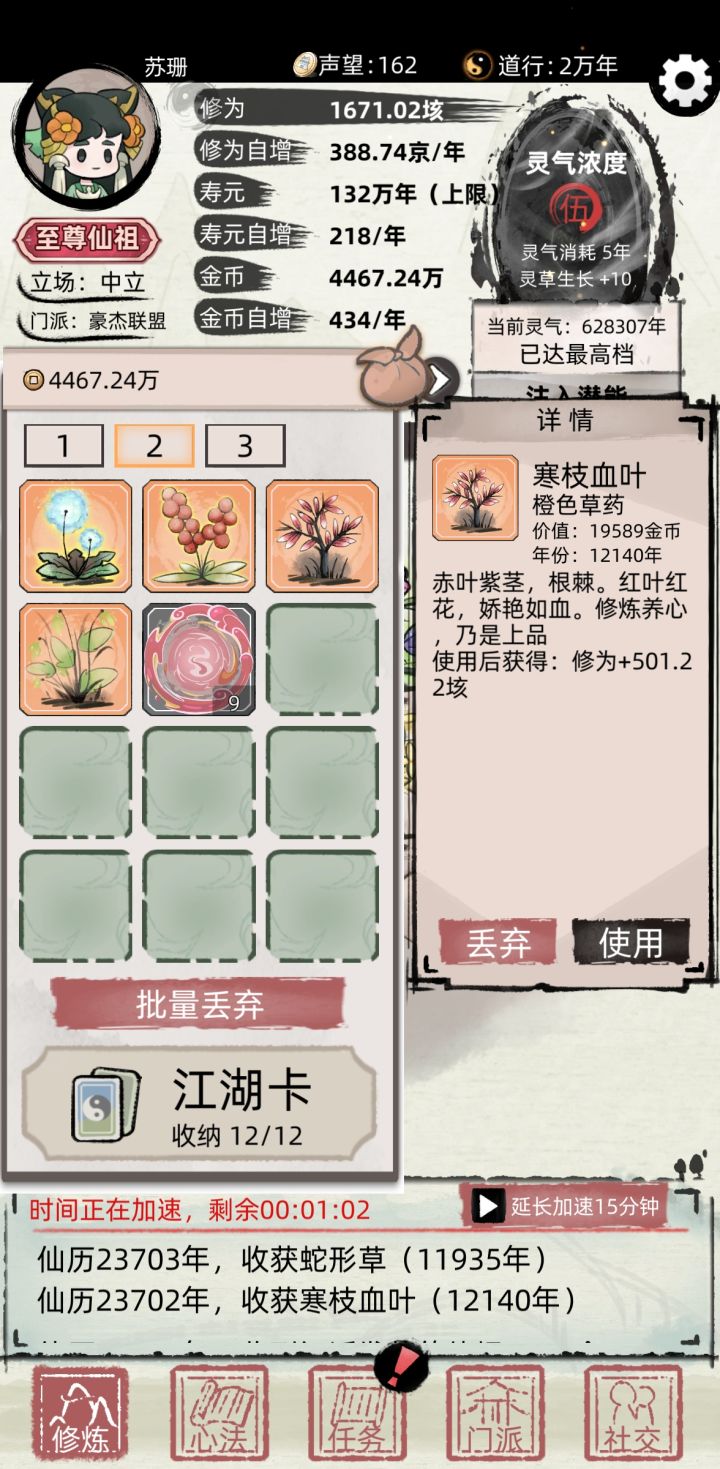 修仙世界 金钱开道!此攻略主要面向老手,各种小技巧让你熟悉游戏后更快修仙转世到九重天。先上毕业照1、开局到加入第一个宗门,推荐正道宗门,正道功法有金钱,寿元加成。2、正道功法篇:接奖励箱子的正道立场任务,领奖时包里不能有同样的箱子,保证你领取的箱子是包里第一个。后面只要包里箱子的一直最少保留有1个,不管你从任务 商店 宗门 得到的中立邪派箱子都只会开出正道功法。(如下图我接个奖励初级宝箱