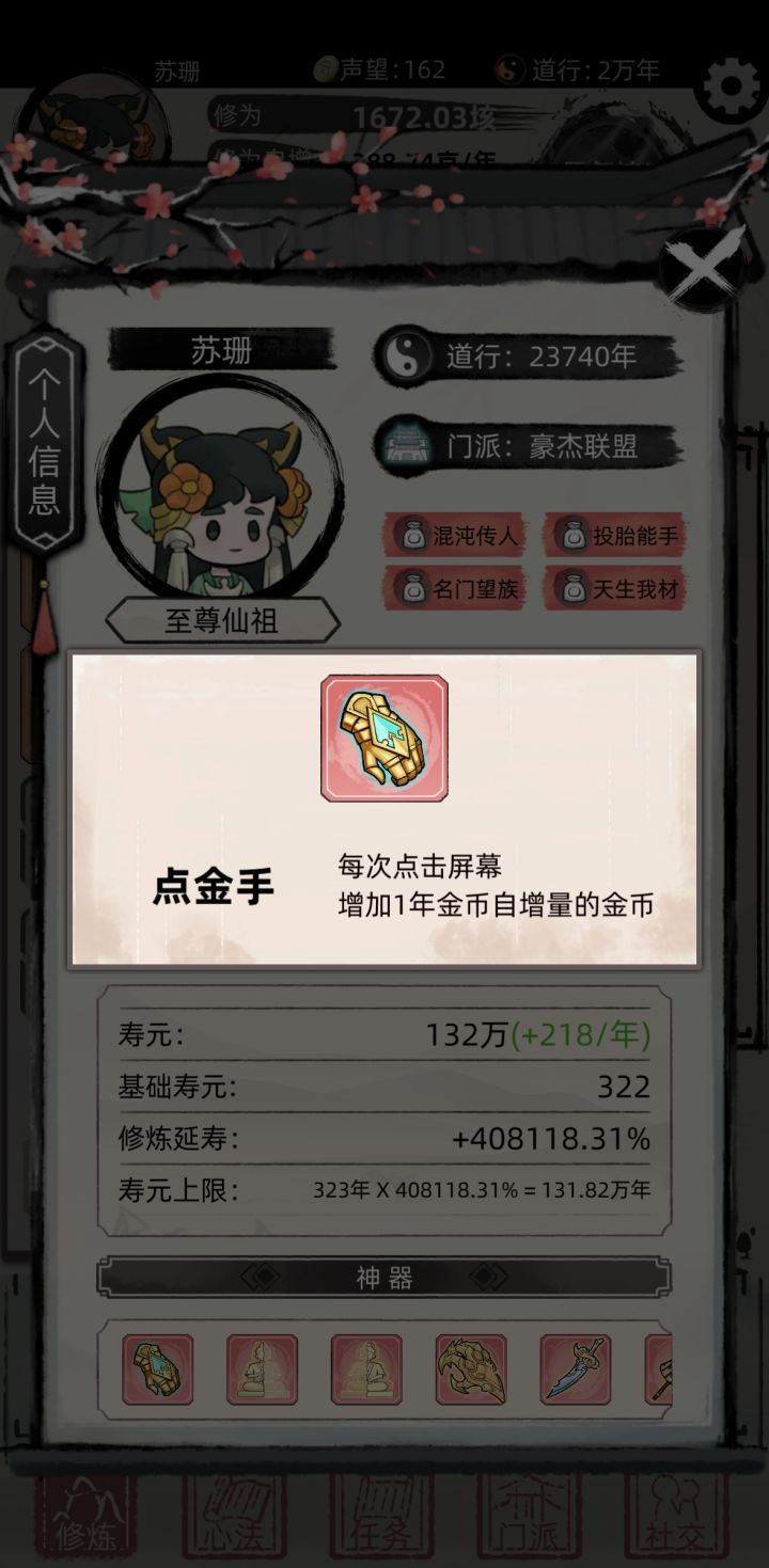 连点器一枚,我用的闪指。如果想佛系游戏,那就升升功法,卡境界挂机下线;体质:商店,广告第三个体质:混沌传人;第一世老老实实按部就班升升功法嗑嗑草药飞升;加速广告看看会快非常多,前期缺钱可以去云游钓点鱼卖店,不是卖鱼市,卖外面的商店;神器:点金手必备,造仙飞刀or创生灵境。造仙需要功法跟上境界,创生不需要;转生仙树埋三个东西:一个太阳圆盘7000%点击修炼,两件天一羽衣10000%点击修炼。