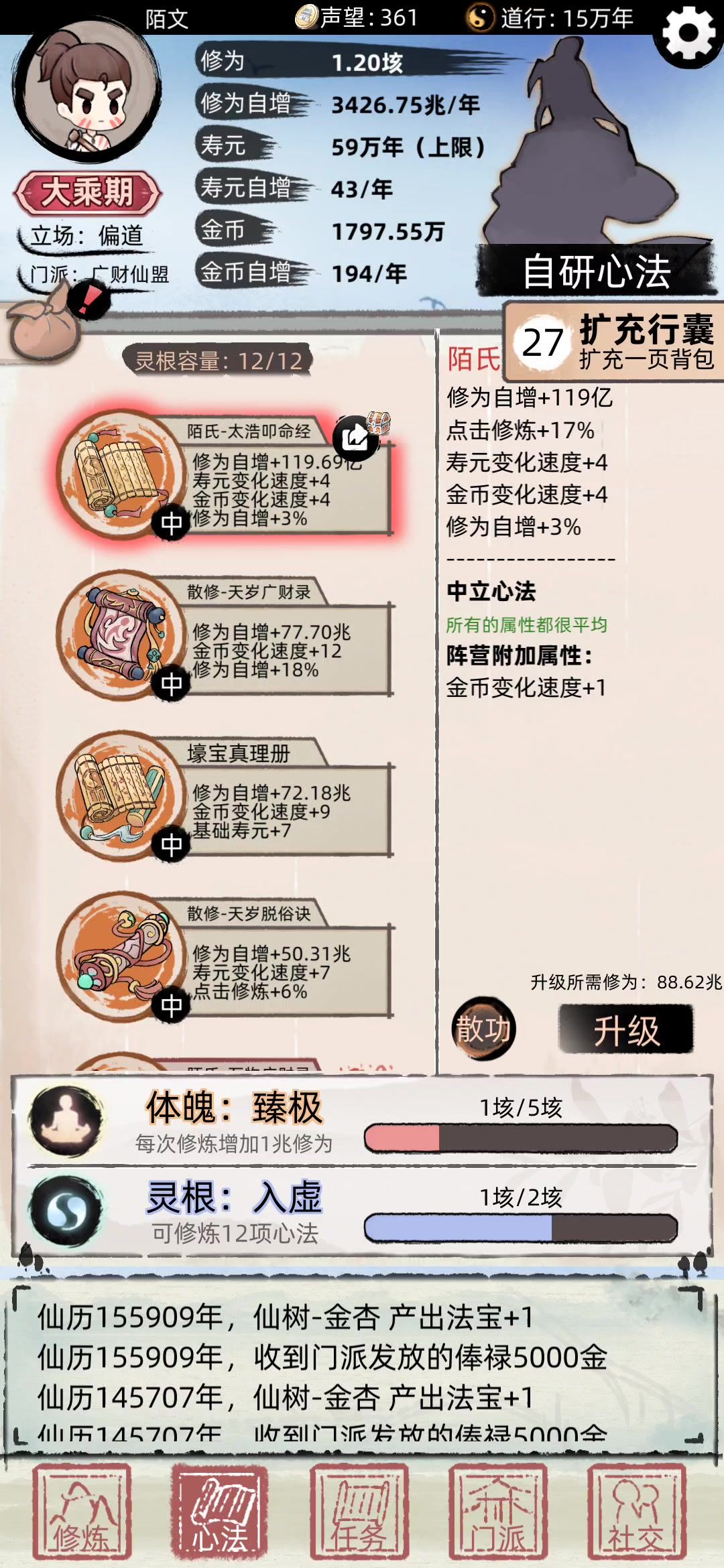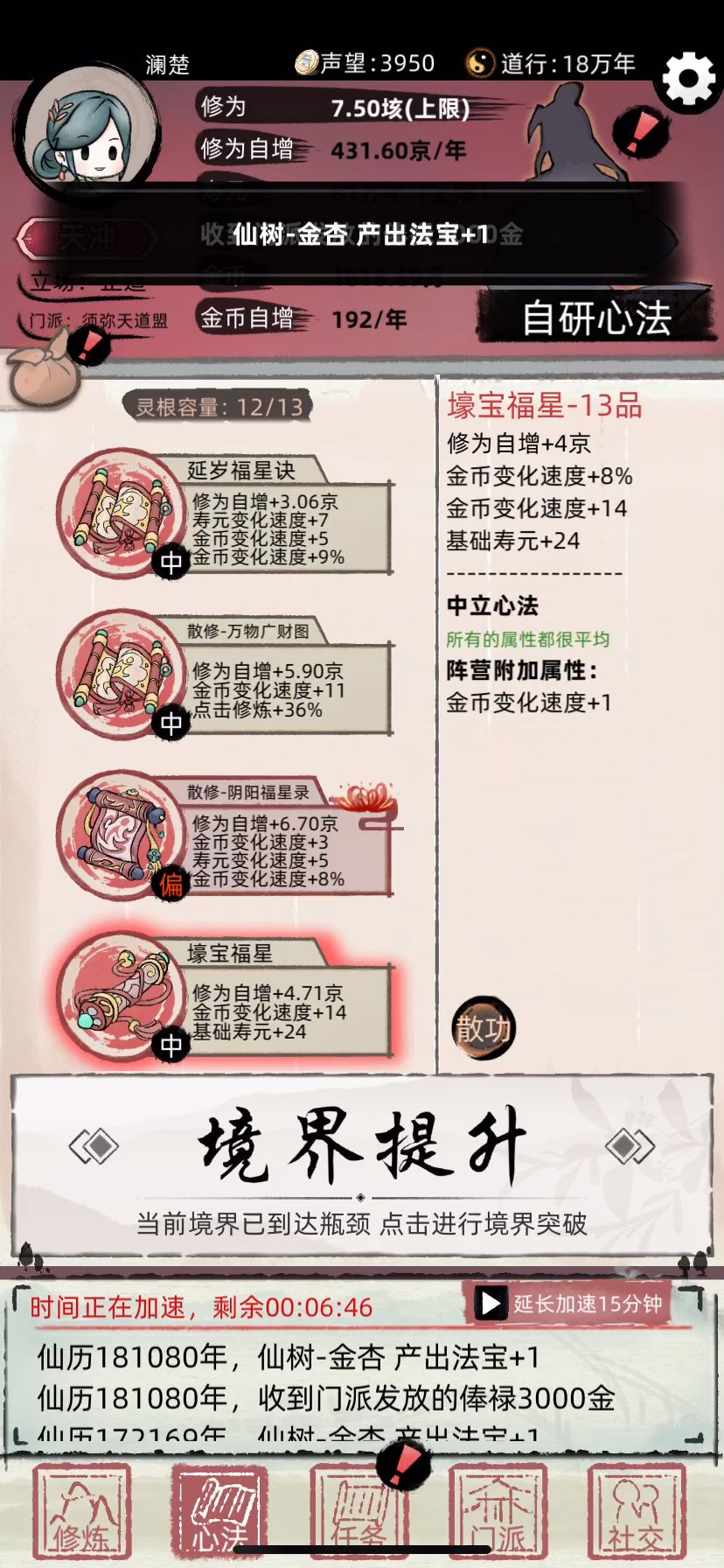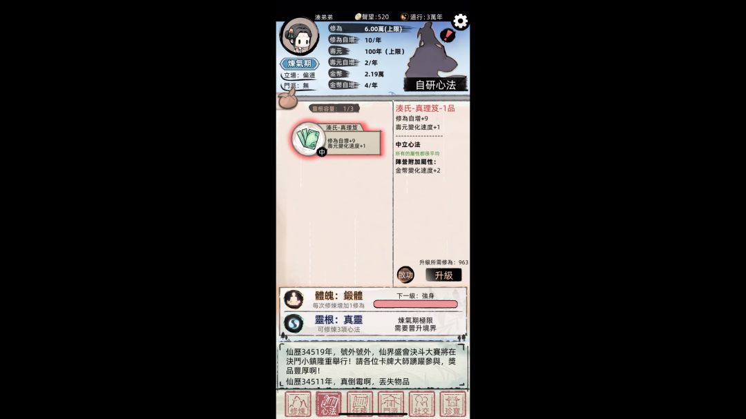 相信这个状态不少道友也有遇上过 在升去下一重天的时候闪退/把游戏程式转到背景 再进去游戏的时候 角色会变成凑弟弟+没有天赋+零寿元 然后一突破就会死掉 不突破也会寿命耗尽 拯救方式需要一点运气 首先需要自研功法/商店在百年内(200秒内) 出一个可以加寿元的功法或法宝 让寿元卡在100年上限 这边务必注意 散功会导致寿命变成1 在这个情况下再度散功就会死掉 然后靠卡牌对战赚第一桶金 花时间搞大概1