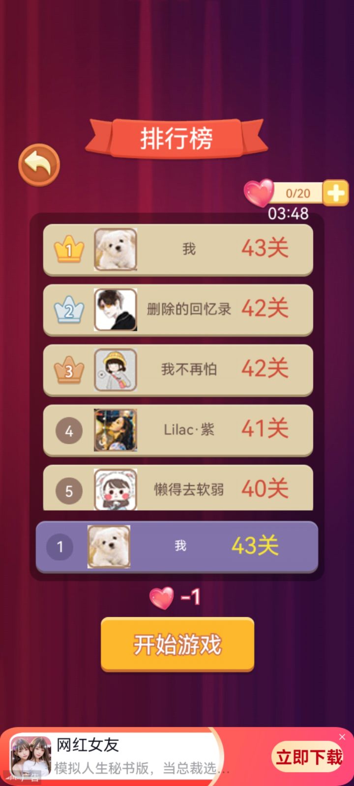 操作很简单的小游戏,类似的也不少,我玩主要是好奇为啥都只玩到42关,以为43关比较难或者只有42关,结果并没有,我以43关排第一