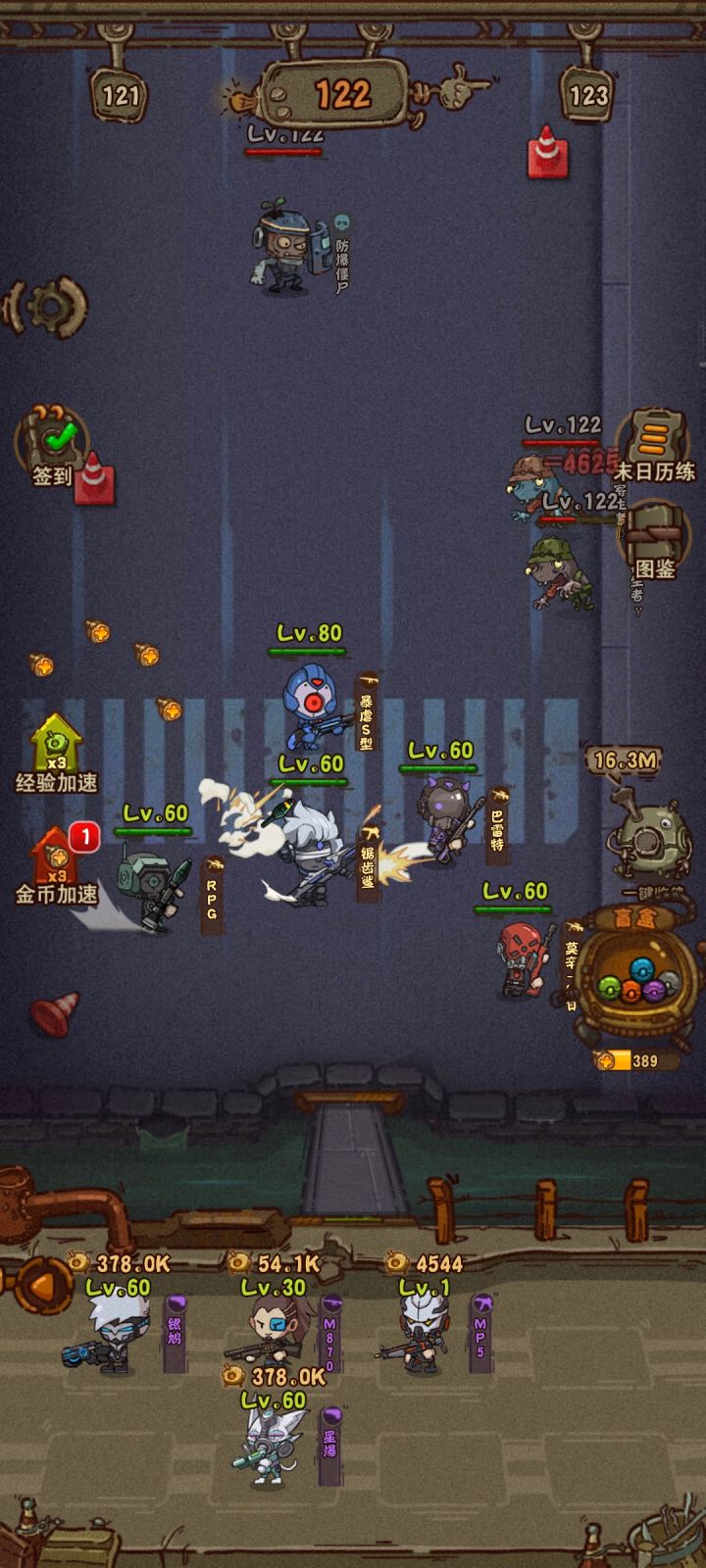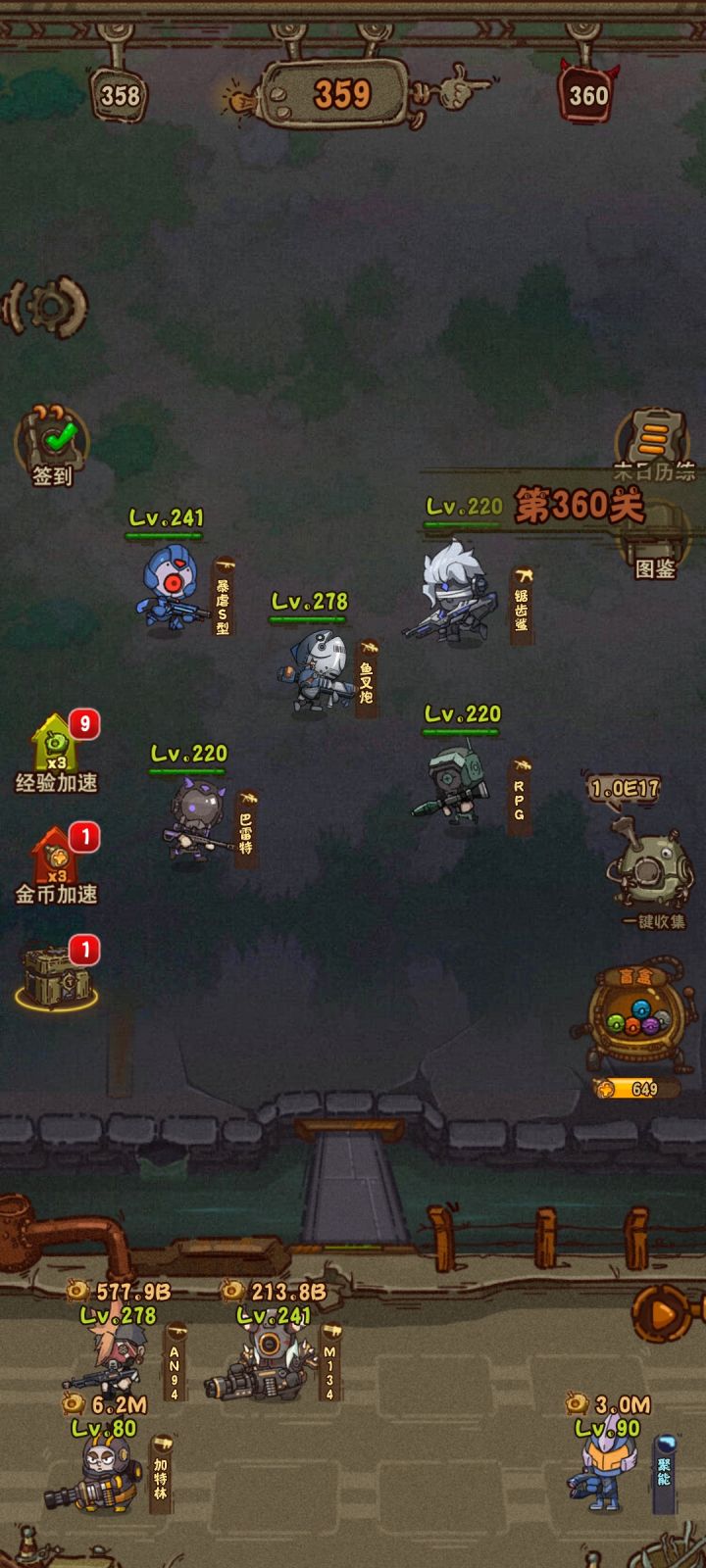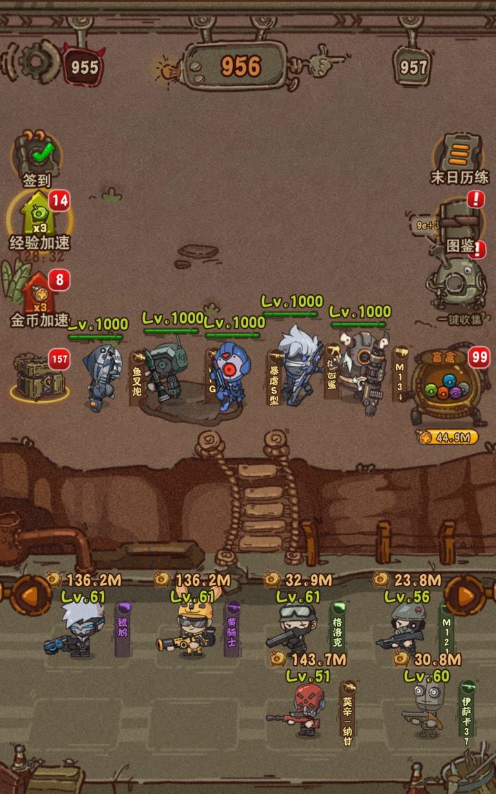 最强五人组了应该是,不服来辩,暴虐s是最厉害的肉,鱼叉枪是最强的输出,巨齿鲨,rpg,巴雷特是全体加攻buff,这三个可以换成m124或者加特林。不过我感觉这游戏后期打不过的关卡应该是上3个全体加攻buff,然后鱼叉杀枪主c,其他四个人当炮灰,然后用手指操纵鱼叉枪规避伤害一直刷关卡