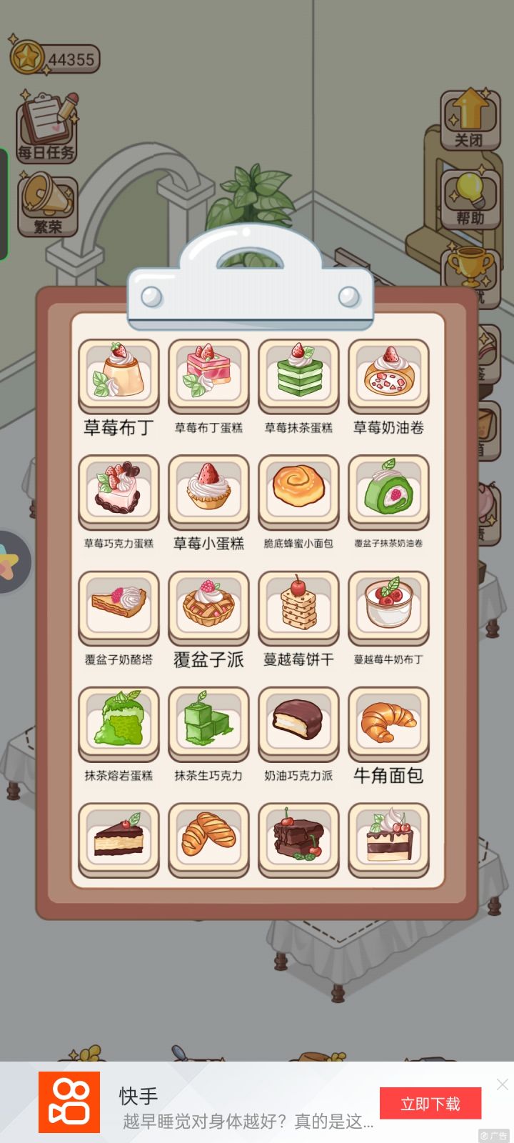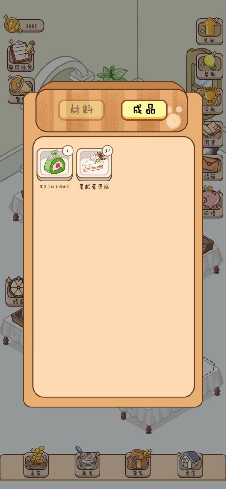 快没法玩了。小麦收获太慢一次太少。地升级了六块,也不知道有啥作用,是收获时间变短,还是产量变多。但做的速度根本够不上卖的速度。草莓抹茶蛋糕。显示需要草莓*2小麦粉*2抹茶*1。有个任务需要十个。我提前买好十个抹茶结果做了四个就没了。用的材料数量不对。