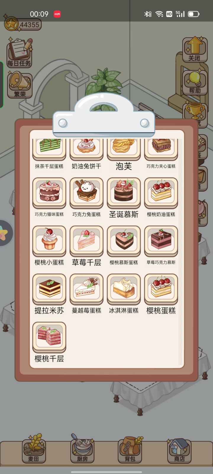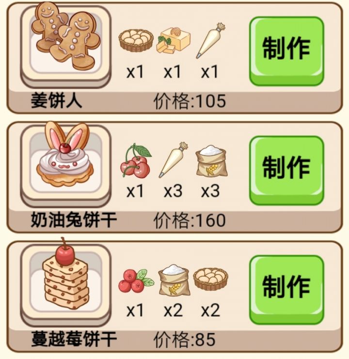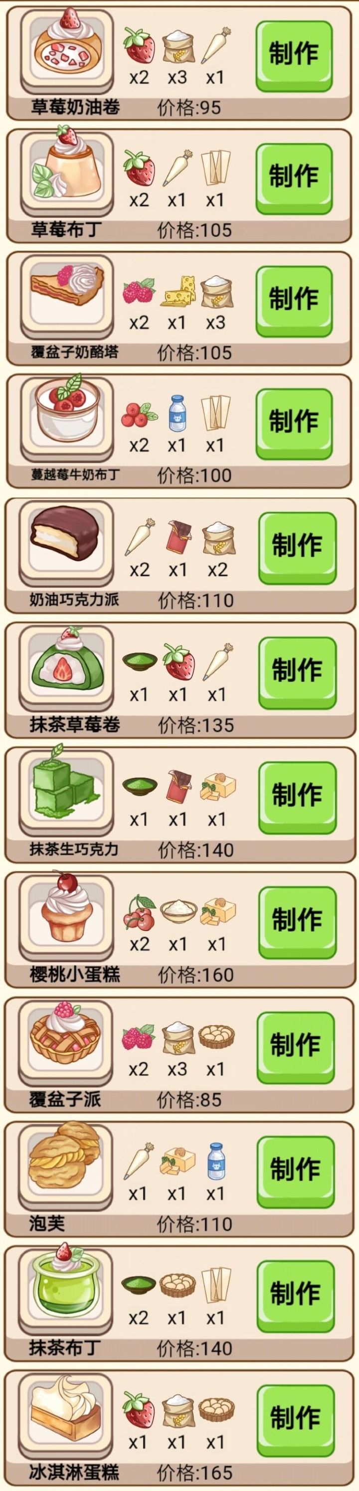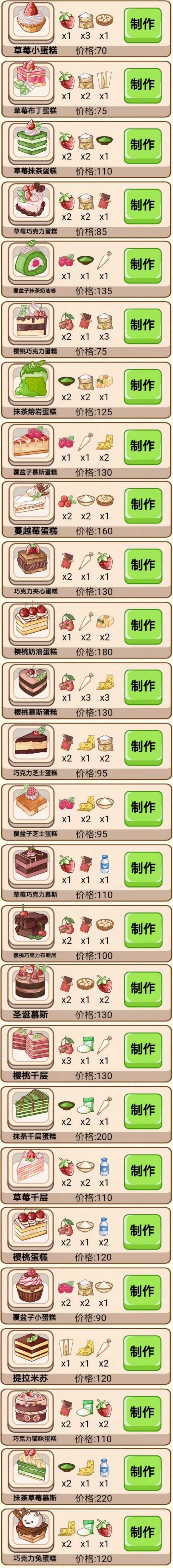 全食谱不得不说,这个游戏设置真的很不合理……面粉太难得了,收入也不合理,做蛋糕只有一个一个的点不说,还卡…