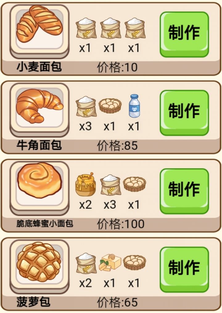 小麦粉=10×小麦小麦面包=3×小麦粉牛角面包=小麦粉+鸡蛋+牛奶脆底蜂蜜小面包=蜂蜜+小麦粉+鸡蛋草莓小蛋糕=草莓+小麦粉+鸡蛋草莓奶油卷=草莓+奶油+小麦粉姜饼人=鸡蛋+黄油+奶油