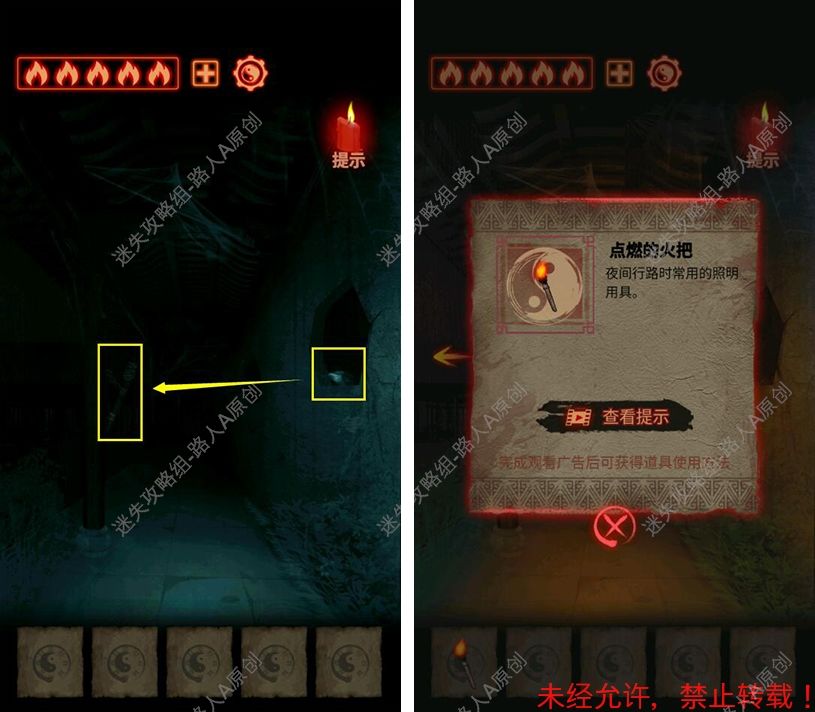 序章攻略 1.跟随教程操作,进入荒宅。 2.拾取走廊墙洞里的【打火石】,用【打火石】点燃火把,拿走【火把】。2.1 3.进入西厢房,用【火把】点燃桌上的蜡烛。3.1 4.打开梳妆台的抽屉,查看日记,得到密码【937】。4.1 5.输入密码【937】,打开柜门,拾取【碎布】,查看纸条。5.1 6.用【碎布】擦掉镜子的灰尘,获得线索。6.1 7.根据线索,输入密码,打开盒子,拾取【钥匙】并且查看信件。