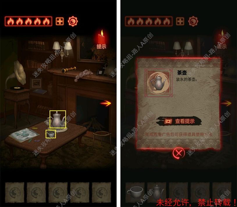 第二章攻略 35.拾取茶几上的【茶壶】和【茶杯】。35.1 36.查看茶几上的绘画,拾取【颜料笔】。36.1 37.查看壁炉,拾取【望远镜】、【大蒜】和【碳灰】。37.1 38.查看书架,拾取【钥匙】和【道符】。38.1 39.播放留声机,打开抽屉,获得【火柴】和【画碎片】。39.1 40.前往走廊,点击按钮开灯,将【画碎片】放入挂画。40.1 41.将【大蒜】挂在楼梯扶手,驱离挡路的小鬼。41.