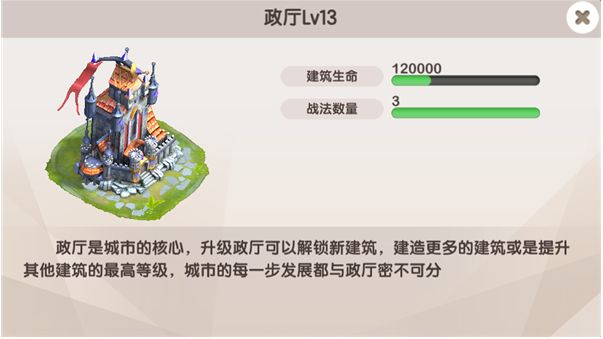 城建系统是《进击吧!三国》里面一个核心的系统,基本上游戏的大部分内容都是围绕着城建系统中的建筑物进行的,建造完成后才可以解锁对应的游戏玩法。建筑物按照类型可分为“功能建筑”、“资源建筑”、“防御建筑”,那下面就给大家简单介绍一下。一、功能建筑政厅(初始建筑)酒馆(初始建筑)祭坛(初始建筑)集市(初始可建造)斗技场(政厅Lv3解锁)科技所(政厅Lv4解锁)王国堡垒(政厅Lv5解锁)征